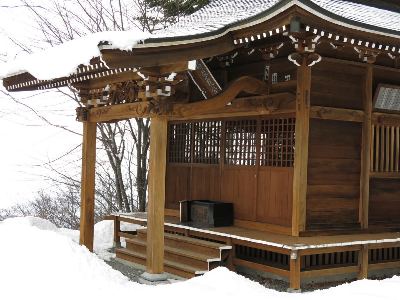 説明書きによると、昭和12年ごろ建てられた観音堂とのこと。冬行ってきました。参道からお堂まで真っ白な雪に包まれて、野生動物らしき足跡意外は、何も見当たりませんでした。ので、人っ子ひとり見えず、とても静かでしたよ。白い雪に映るお堂の木の色合いが