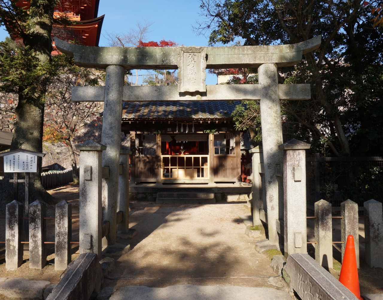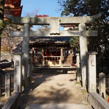 石造りの鳥居、瓦葺の拝殿、その奥に桧皮葺の小さな朱塗の本殿があります。