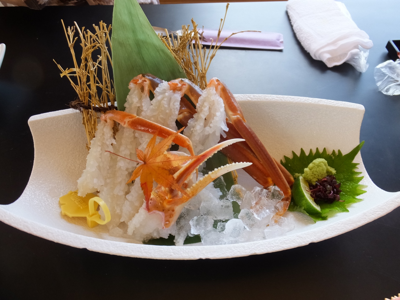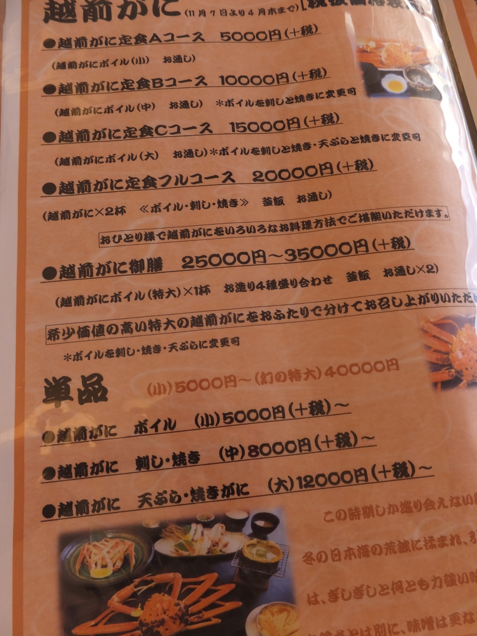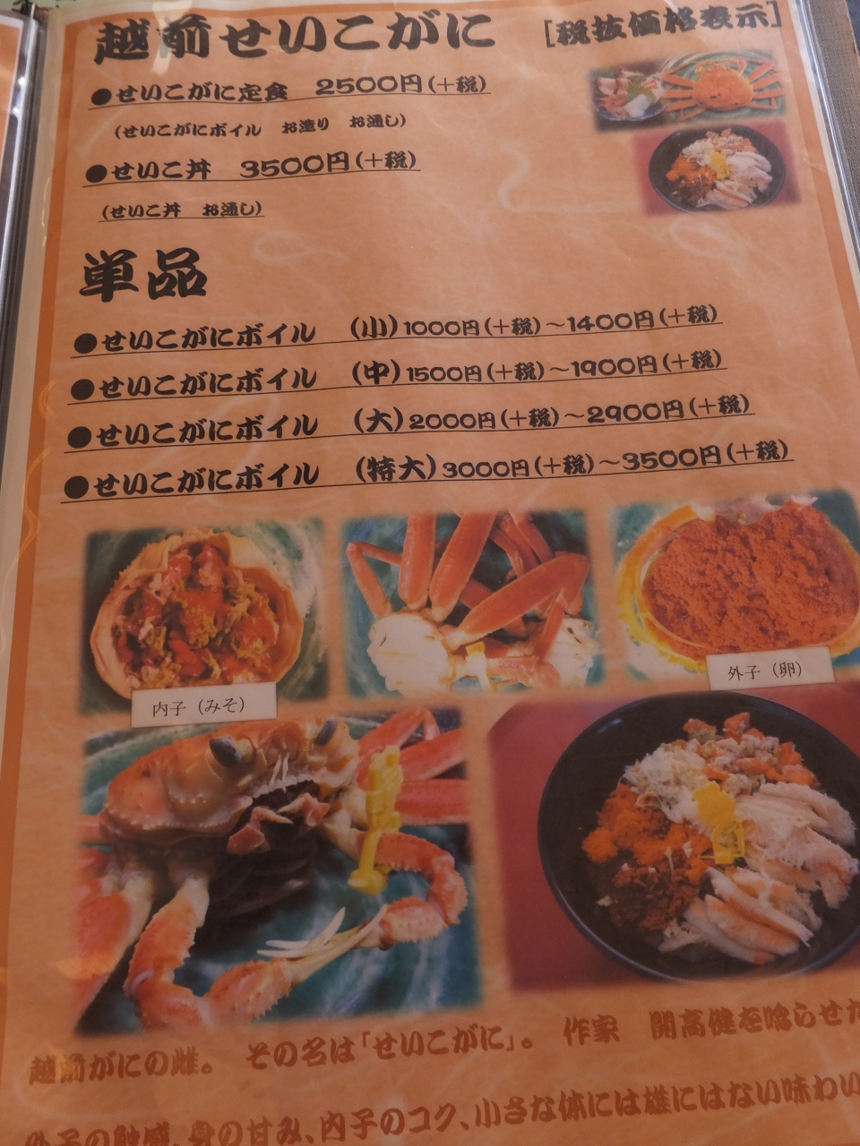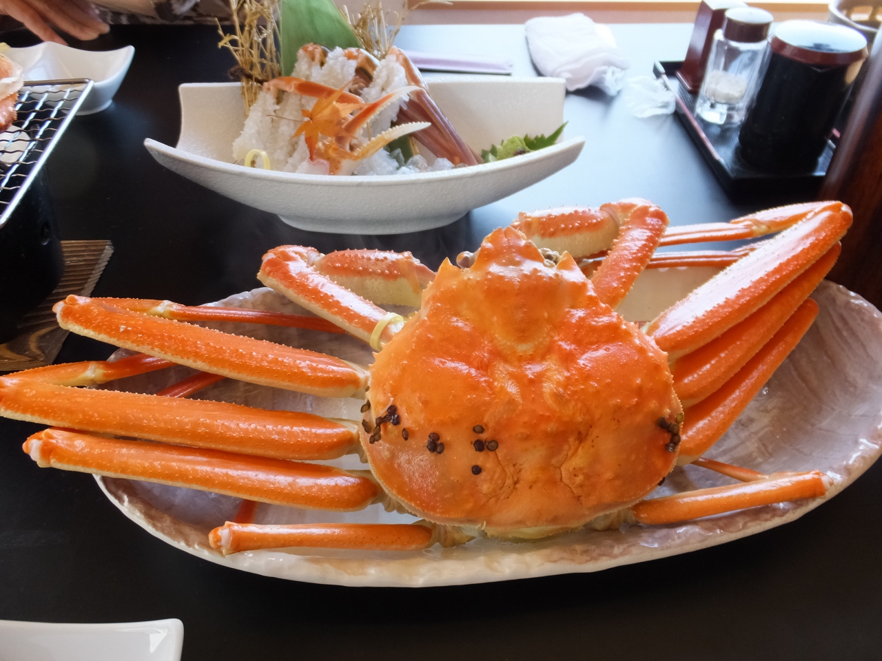 越前ガニ定食で蟹、一杯は茹で蟹で、もう一杯は半分は刺身で、半分は焼き蟹でお願いしました。