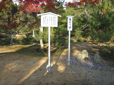 奥には、「白蛇(はくじゃ)の塚」があります。この辺りは繁栄を極めた西園寺家の旧跡です。