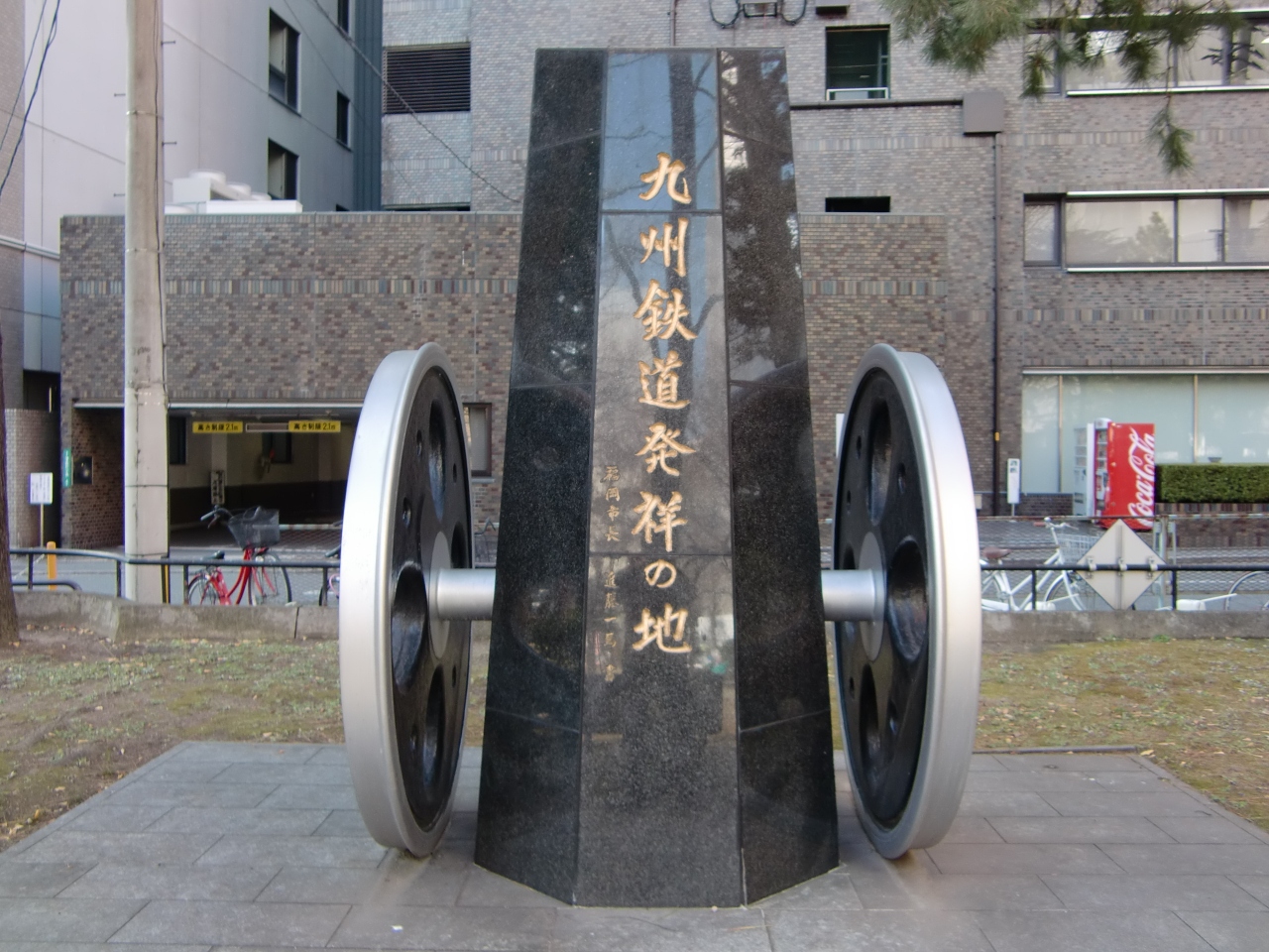 明治22年に九州で初めて鉄道が走り、その記念碑が博多区の出来町公園に建てられています。