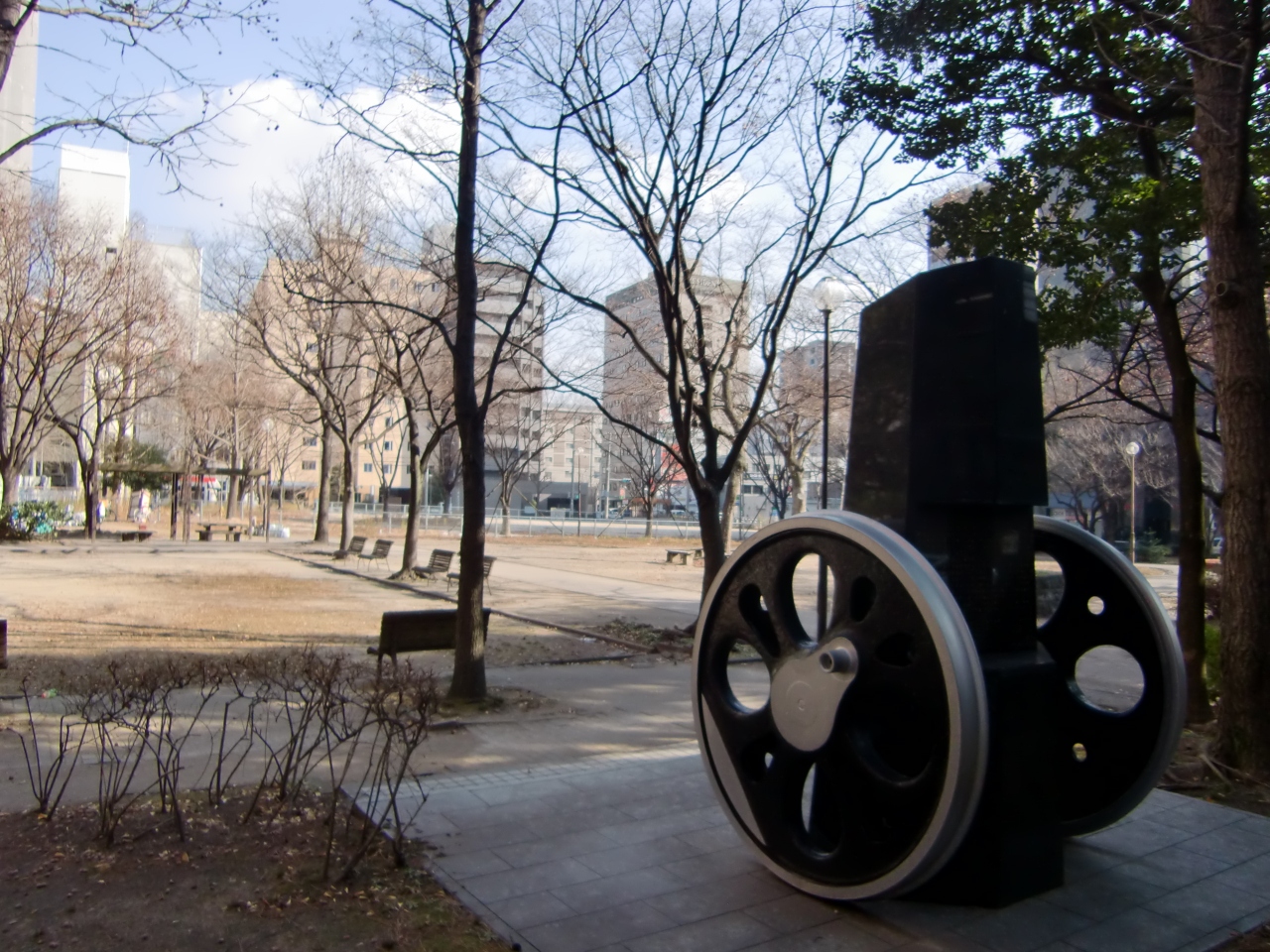 鉄道の車輪をイメージした記念碑で、公園の一角に建てられています。