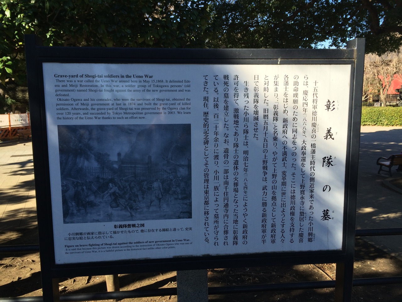 墓石には「彰義隊の墓」ではなく「戦死之墓」と刻まれているそうですが、あまりに達筆過ぎて正直よくわかりませんでした。墓石のまわりには柵がしてあります。