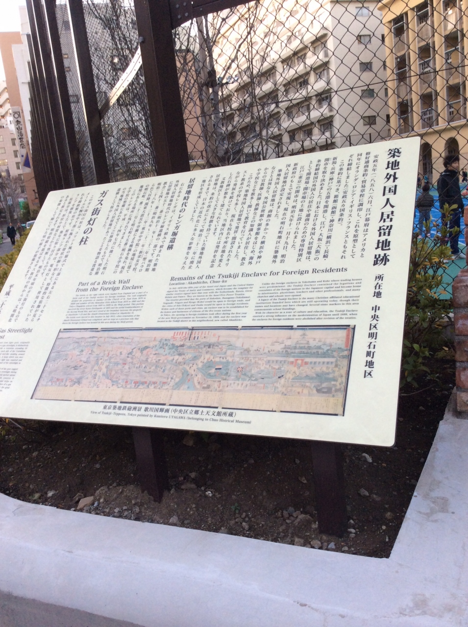明石小学校のグランドのフェンスの外側にあります。明治初年に明石町付近を外国人居留地とし、交易を自由にしたことにより、この付近が洋風文化輸入の拠点となったため、至る所が文化の発祥地となっています。ここから散策を始めましょう。