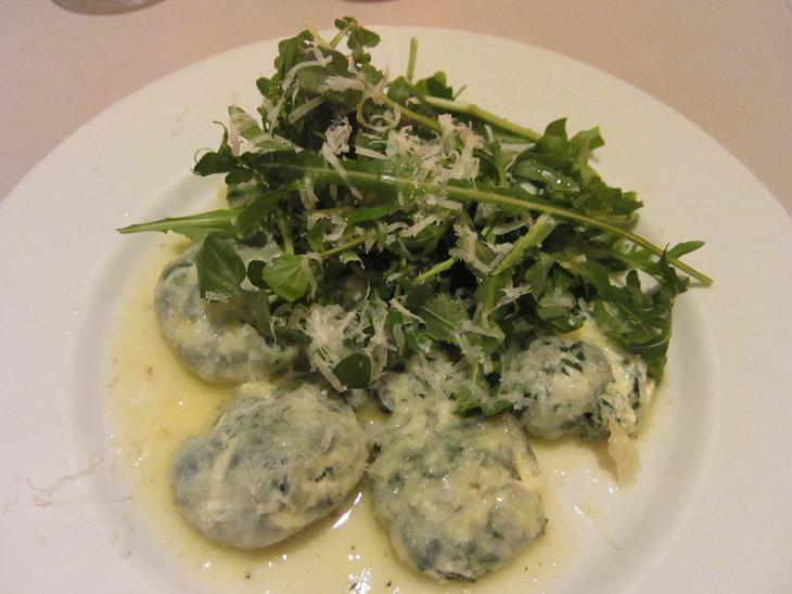 ラビオリは皮が中身が透けて見えるほど薄く、中にはほうれん草とリコッタチーズがぎっしり詰まっています。レモン風味のさっぱりとした味でした。