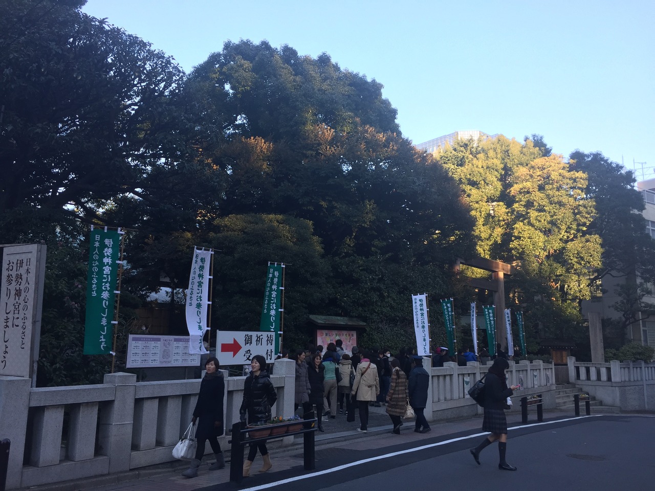 神社の境内を楽しむ前にビルの中で並ぶ状態。