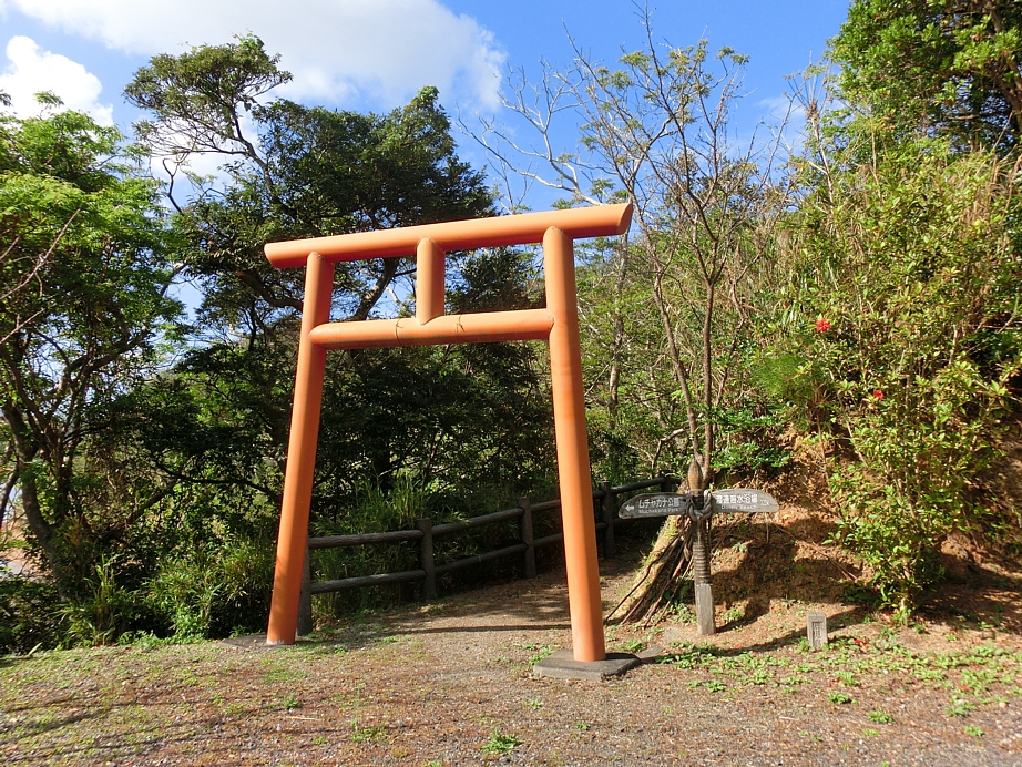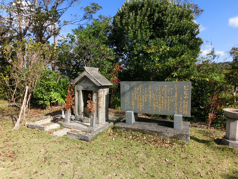 鳥居を潜り未舗装の坂をえっちらおっちら10分弱息を切らして上った先にあるものは、とても小さな広場に「むちゃ加那節」とやらの碑とベンチ2脚のみ。