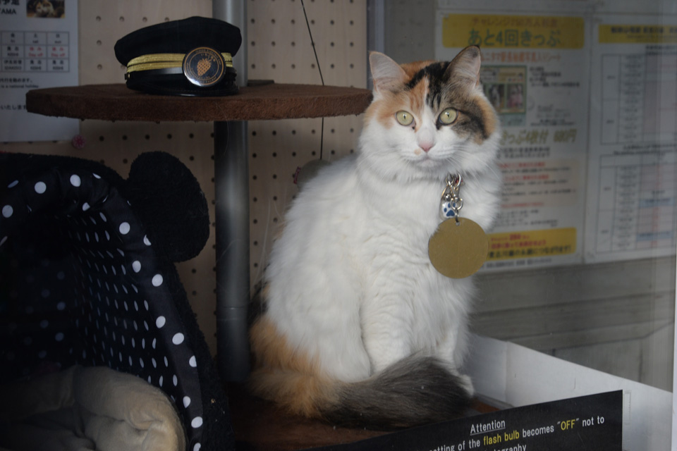 ちょうど私が到着して間もなく、ニタマ駅長が出勤。アクリルのケース越しではありましたが、ちょこんと所定の場所に座って駅を見守っていました。