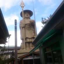 勝川商店街の脇道を入ったところにあります。木彫りの弘法大師像があるので、そこから脇道に入ります。駐車場はありません。お寺自体はとても小さいですが、18mもある大きな弘法大師の像があります。昭和3年に建てられたもののようです。
