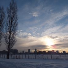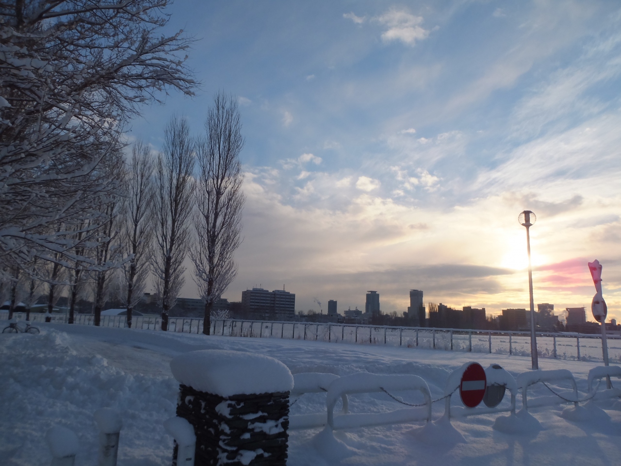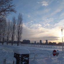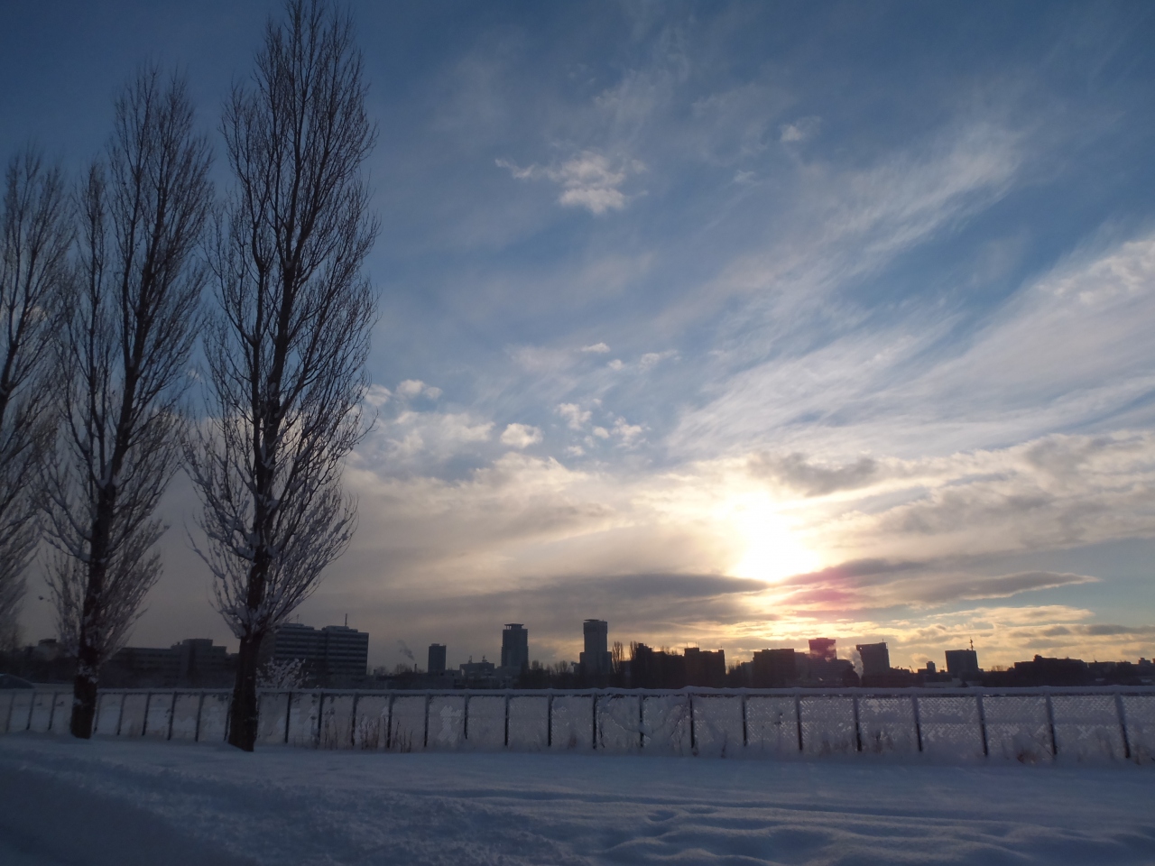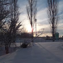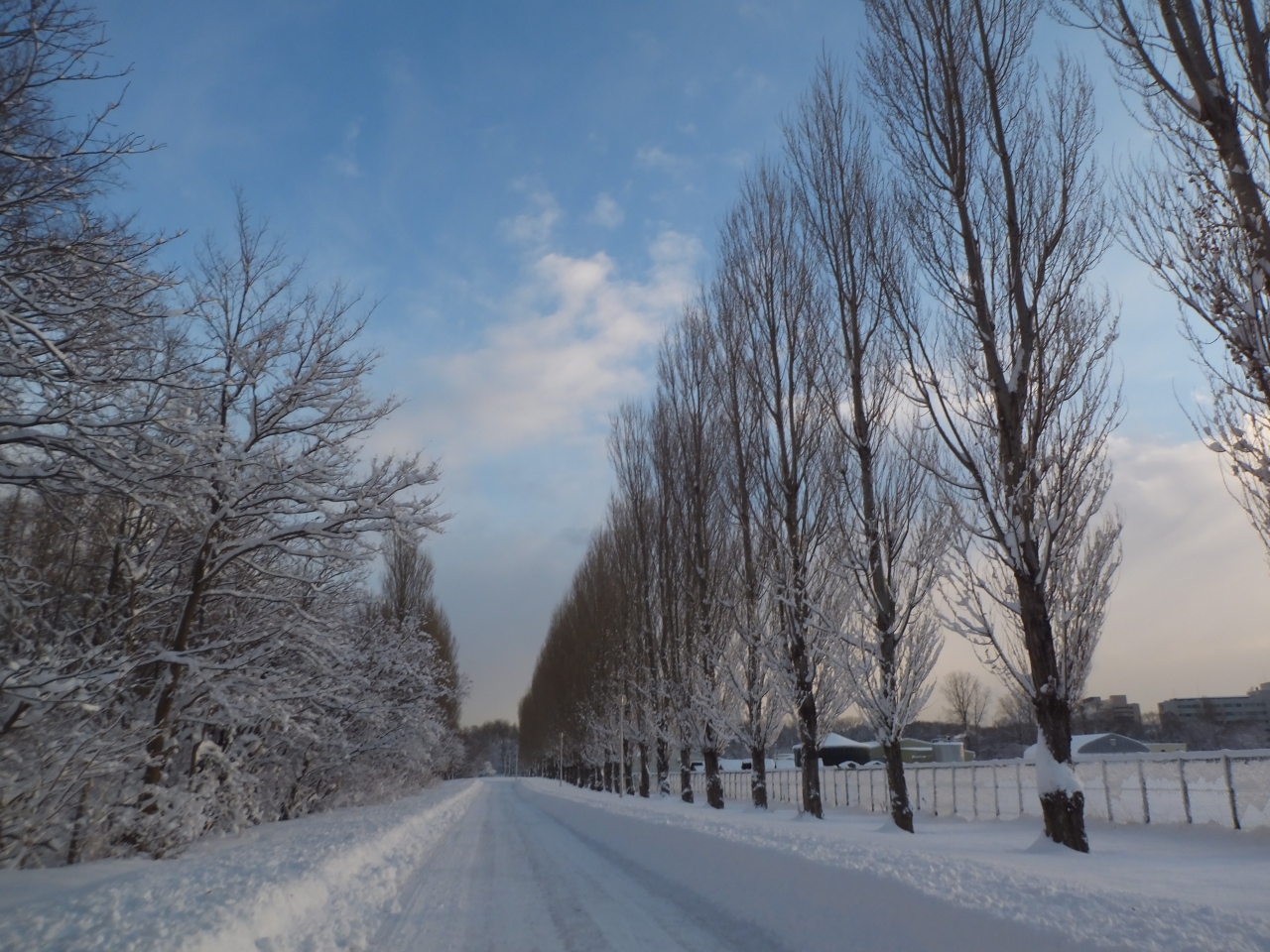札幌の街中にありながら、朝日さす雪原を横目に、雪のポプラ並木を散歩できます。北海道大学のポプラ並木は有名ですが、平成ポプラ並木は同じく大学の敷地内にある、平成に入って新しくできたポプラ並木です。