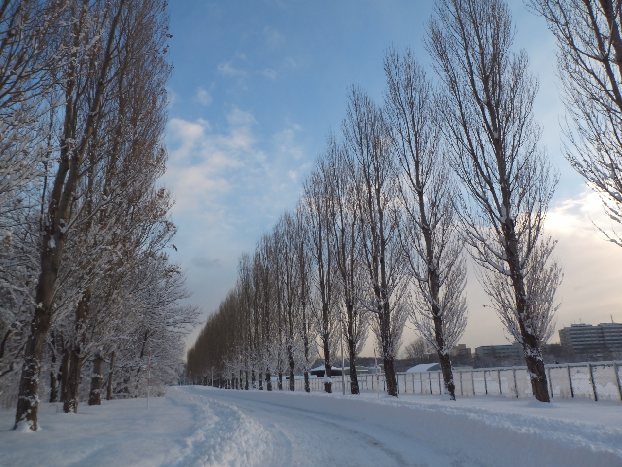 通常のポプラ並木が立ち入れないのと違って、こちらは堂々と並木の真ん中を歩くことができます。大学の西側の門に通ずる車道ですが、門は閉鎖され、広い道を人(または自転車)しか通りません。冬はきれいに除雪されています。