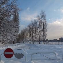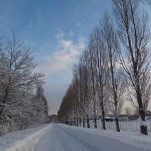 通常のポプラ並木は、農道の両側に背の高いポプラの木が植わり、奥に農場が広がる情緒的な雰囲気がありますが、冬であれば、平成ポプラ並木も負けてはいないと思います。寒いですが、特に朝がおすすめです。長く続いた吹雪が明け、一面銀世界となった雪の道。整然と並ぶ木々を、雪原の向こうから昇った朝日が横から照らします。凜とした空気の中を行く朝の散歩は爽快です(要厚着)。