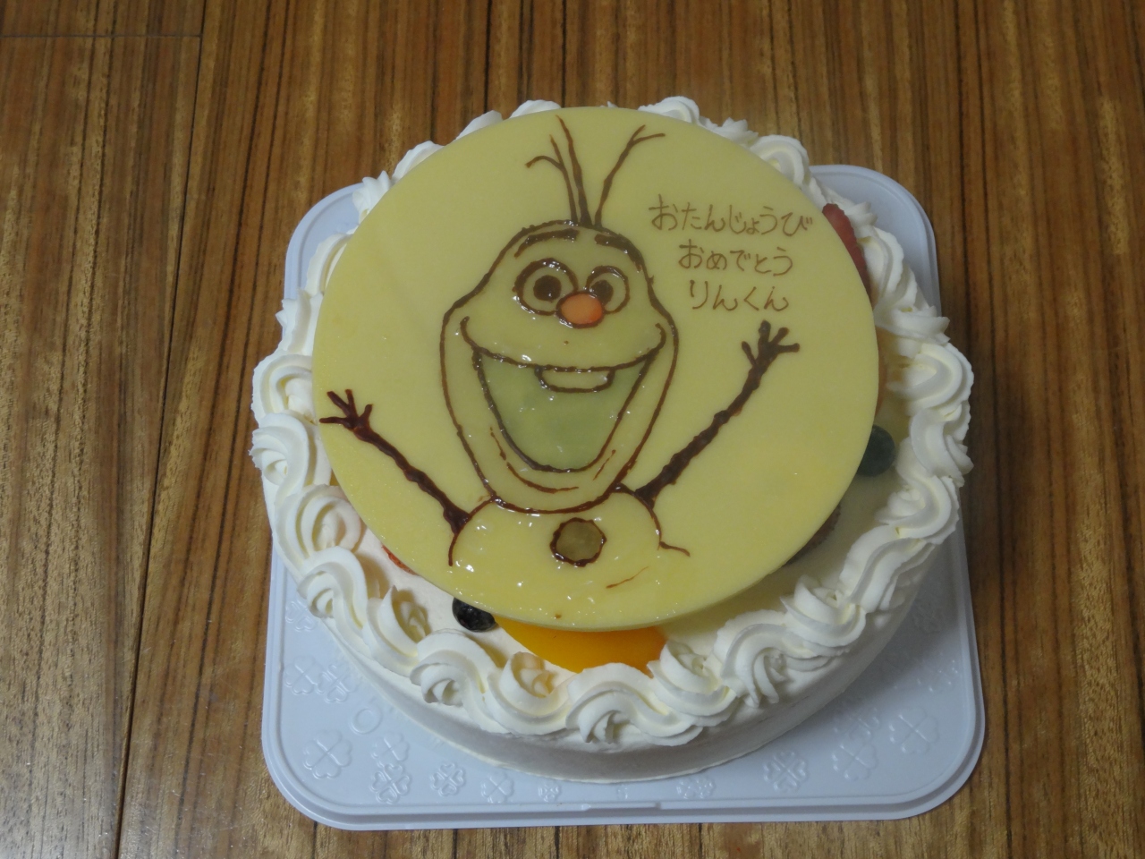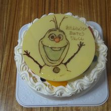 年に3回、子供用にイラスト付きのバースデーケーキを買います。今回は、生クリームのケーキ6号にオラフのイラストをかいてもらいました。ブランカはシェルレーヌが有名で、イラスト付きのケーキの販売は特に宣伝していないようですが、遅くとも2日くらい前にイラストを持ち込み予約しておくとケーキ代プラス500円で作ってくれます。