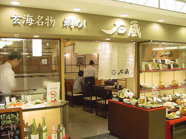 JR博多駅の構内にある「博多デイトス」のB1、レストラン街にある「玄海名物鯛めし」のお店。明るくて清潔感のある店内。ディスプレイにはいろいろな地酒もあって、お酒のつまみもおいしいです。生ビールセットがお得で、天ぷらや刺身までついてきます。