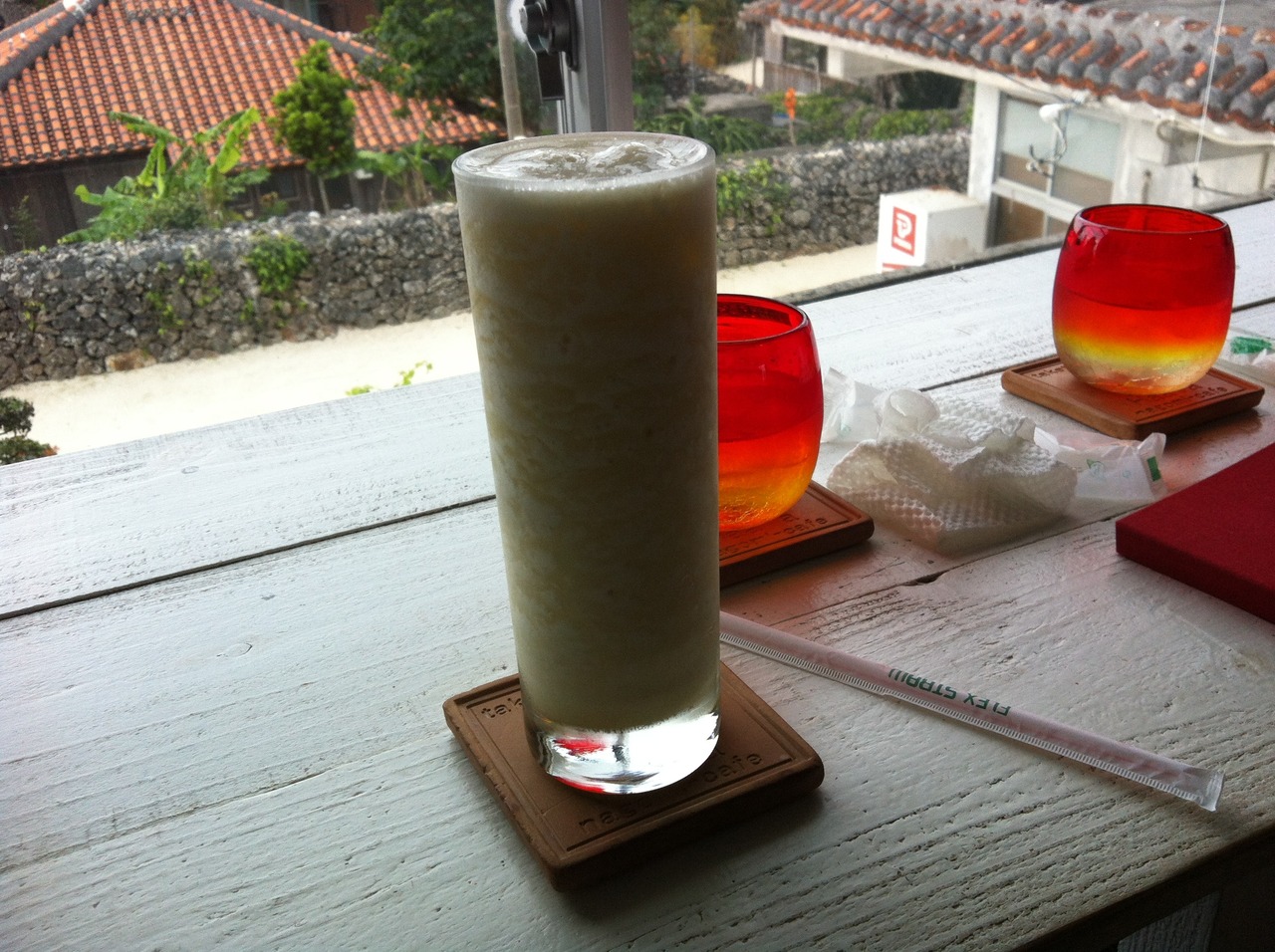 二階にあるんで、景色がいいですし、沖縄の落ちつかない食堂とは全く違うリラックスできる雰囲気なんで長居もできます。メニューは八重山そば、タコライスなど一通りありますが、フレッシュジュースが美味しいです。
