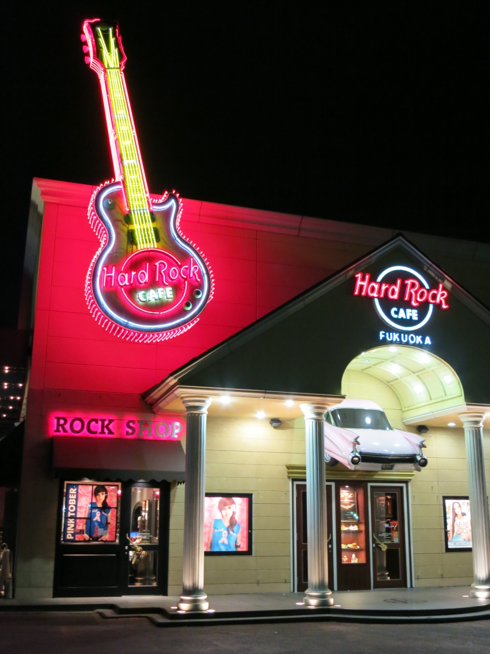 ハードロックカフェのTシャツを買いに立ち寄りました。左のグッズショップの入口の上には赤いギター、カフェの入口上にはアメ車のテールが印象的で、アメリカらしい雰囲気のお店です。これだけ外目が派手なので、夜はとても目立ちます。ハロウィンの季節で仮装した人も多く見られました。