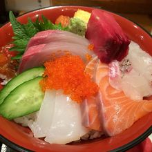 7種類程のネタが乗った海鮮丼は見た目も豪華。