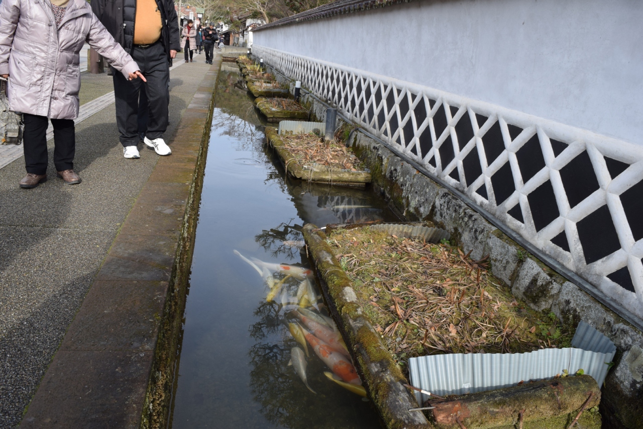 歴史的街並みが保存されているため時代劇の風景に入ったようです。街路の堀割には大切にされている鯉が出迎えてくれます。いったい何匹いるのやら、その大きさに驚きます。堀割の一部には菖蒲床があり初夏の頃には菖蒲が咲いて鯉との競演が美しいと思います。