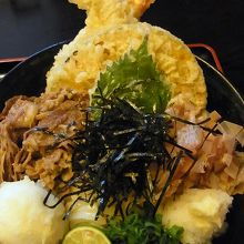 海老天2匹、玉子天、野菜天、牛肉がトッピングされた豪華な饂飩です。