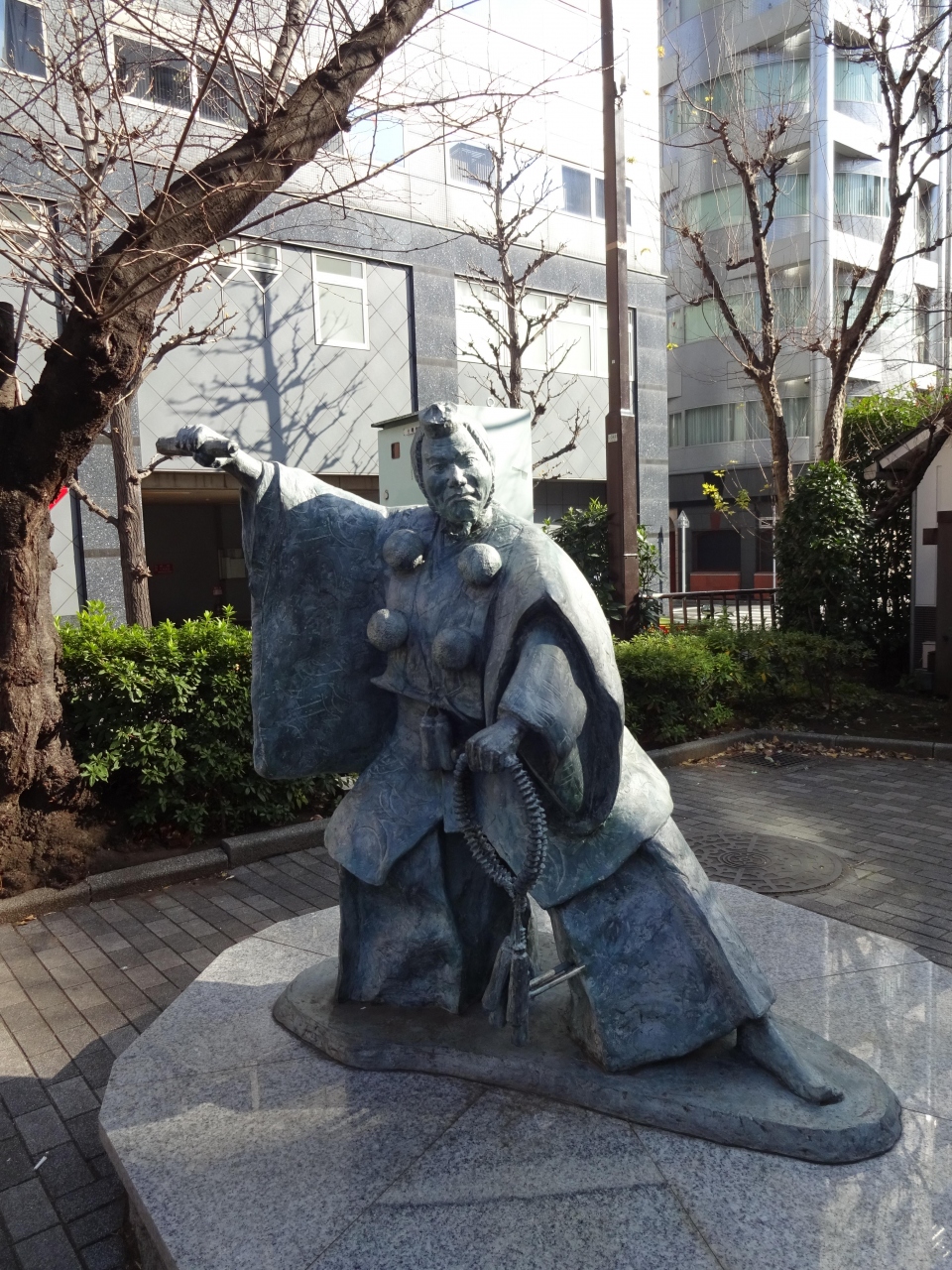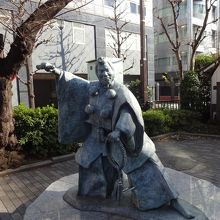 浜町公園の手前、緑道の中に弁慶像が建っています。