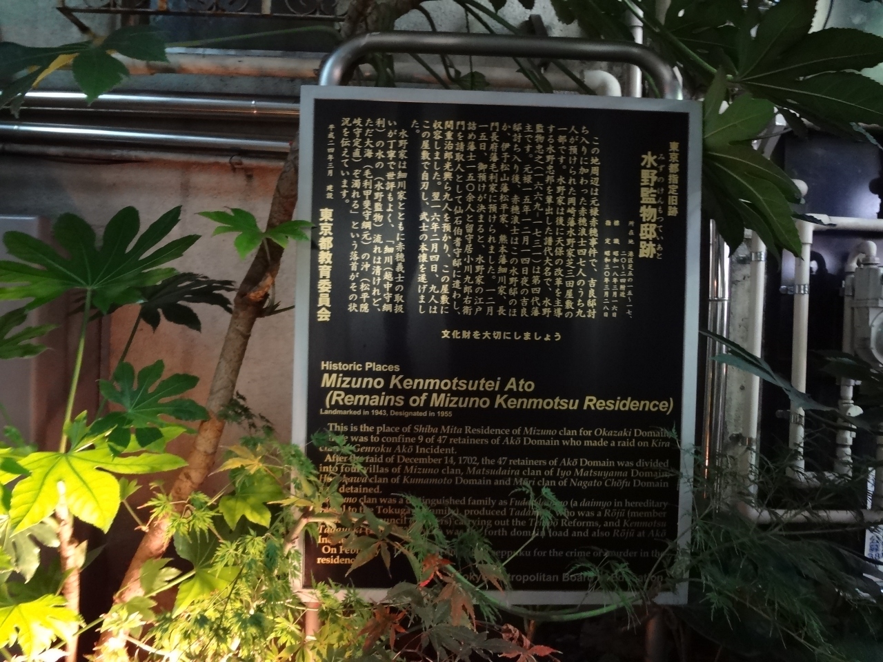 私は水野監物という人物について知りませんでしたが、どうやら案内板を読むと、この場所にあった水野家の屋敷で、吉良上野介邸に討ち入りを果たした赤穂浪士のうち9名が切腹を遂げた場所という事です。
