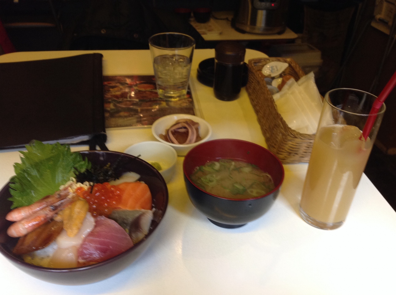 ランチの丼物プラス200円で小鉢、味噌汁、ドリンクがついてお得なお値段でした。
