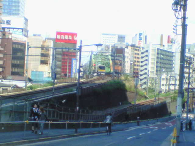 御茶ノ水から秋葉原へ向かう電車がよく見える下り坂