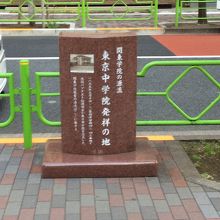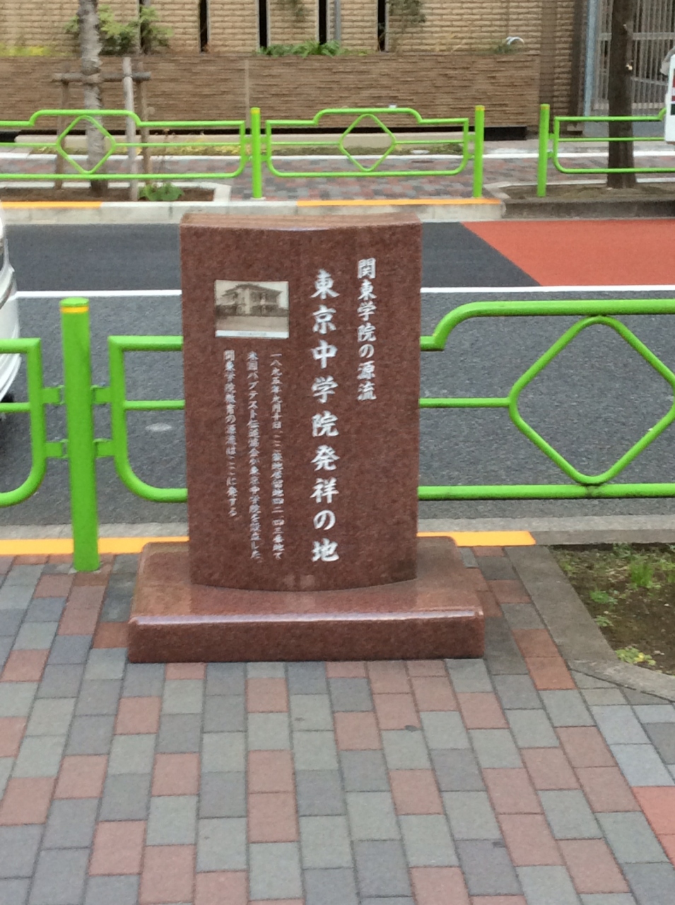 明石小学校を少し北に行くとあります。碑文には1895年9月10日,ここ築地居留地42,42番地で米国バプテスト伝道協会が東京中学院を設立した。関東学院教育の源流はここに発するとあります。現在横浜市にキャンパスのある関東学院が築地が発祥とは驚きでした。