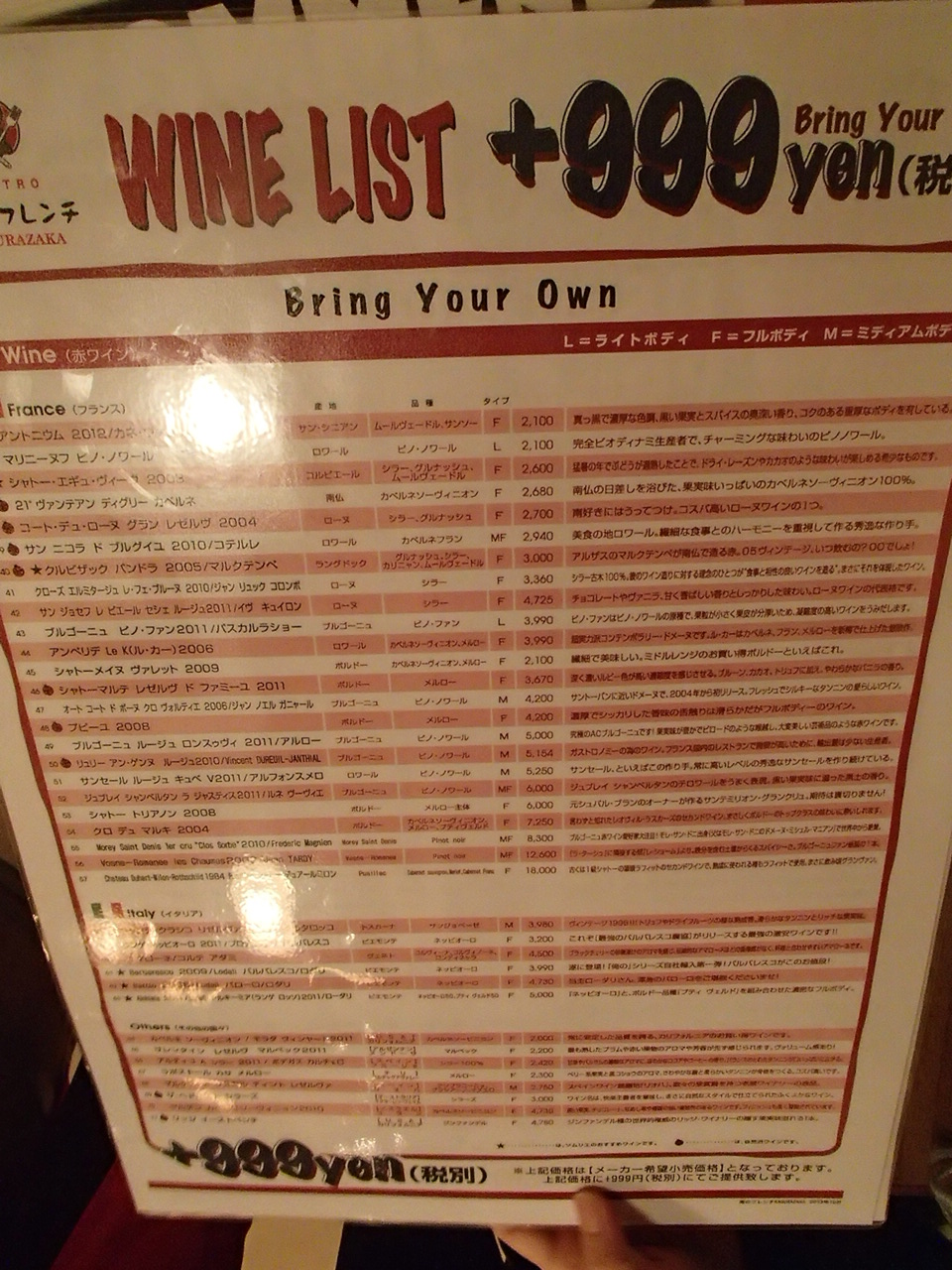 俺のフレンチKAGURAZAKAでは、リーズナブルな価格にてフレンチを食べる事ができますが、ワインも豊富に用意されています。フランス産、イタリア産も含め、ワインリストには、いくつも掲載されています。ぜひ、一度、食べに行ってみてください。