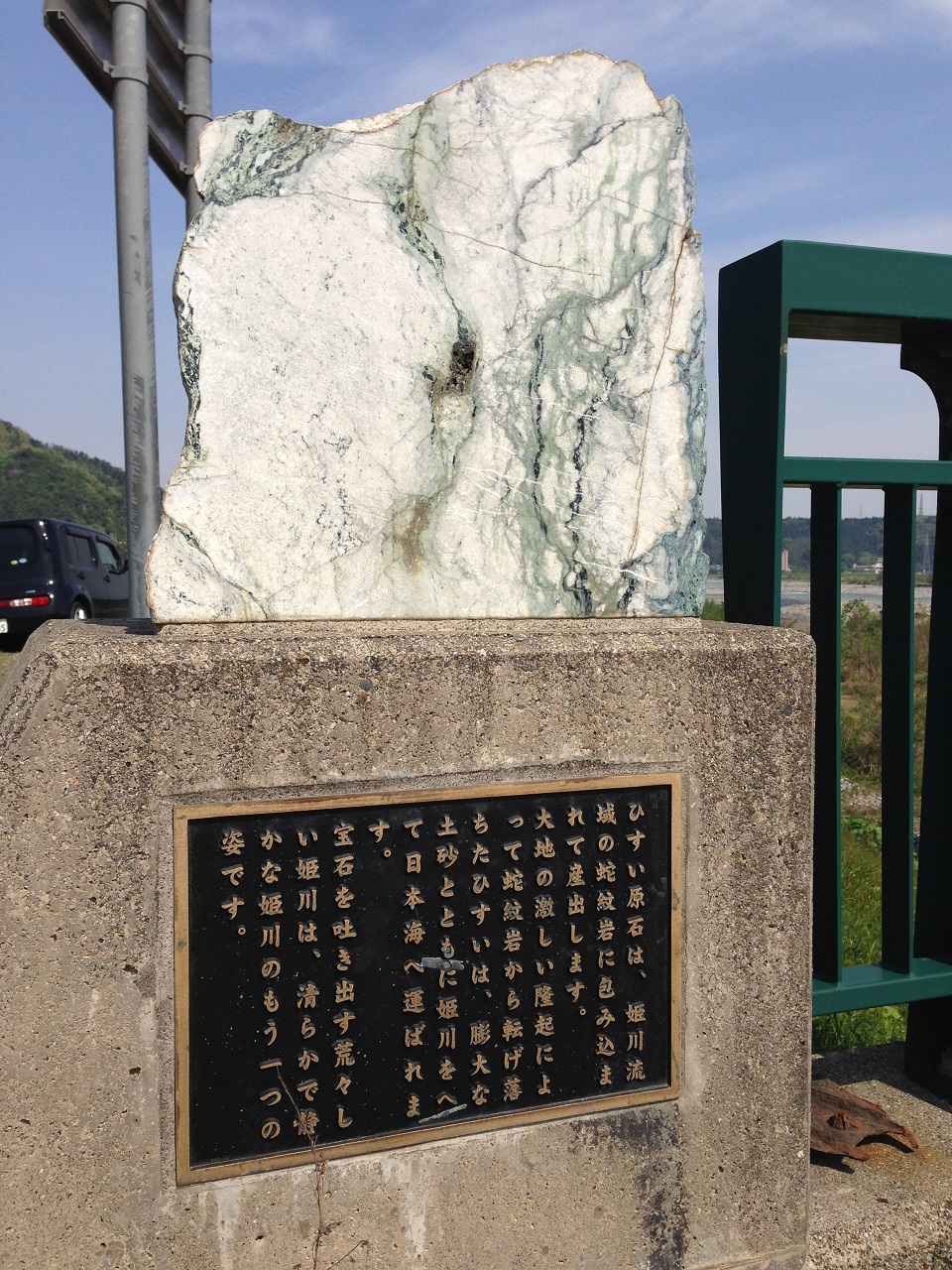 姫川に架かる橋にはヒスイの原石がドンと置かれていて、その存在をアピールしていました。