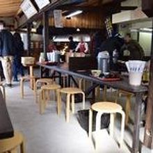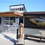 お店の前に十分に広い駐車場があります。このお店は、かつおのたたき(藁焼き)を体験できるということで行ってみました。お店に入るなり「自分でやりますか?」と聞かれ「ハイ」と即答。手渡されたカツオの串を持って支えていれば、店員の人が藁をくべて、指示をしてくれるので安心です。炙ったタタキは目の前で切り分けてくれ、塩・わさびとともに盛りつけてくれます。 他のトッピングはセルフで好きなだけ盛ります。 玉ねぎのスライス、ニンニク、ワカメ、レモンがありました。