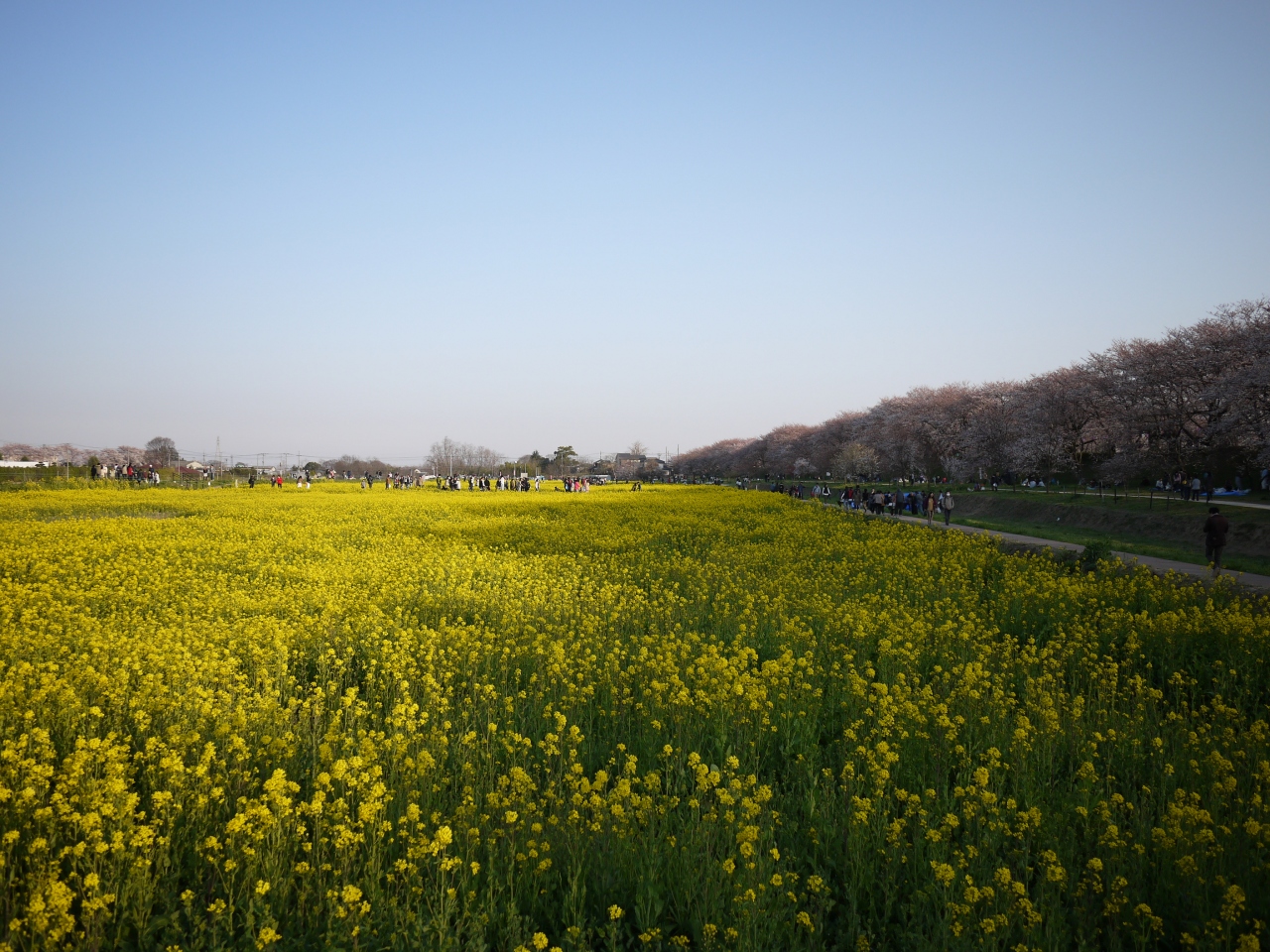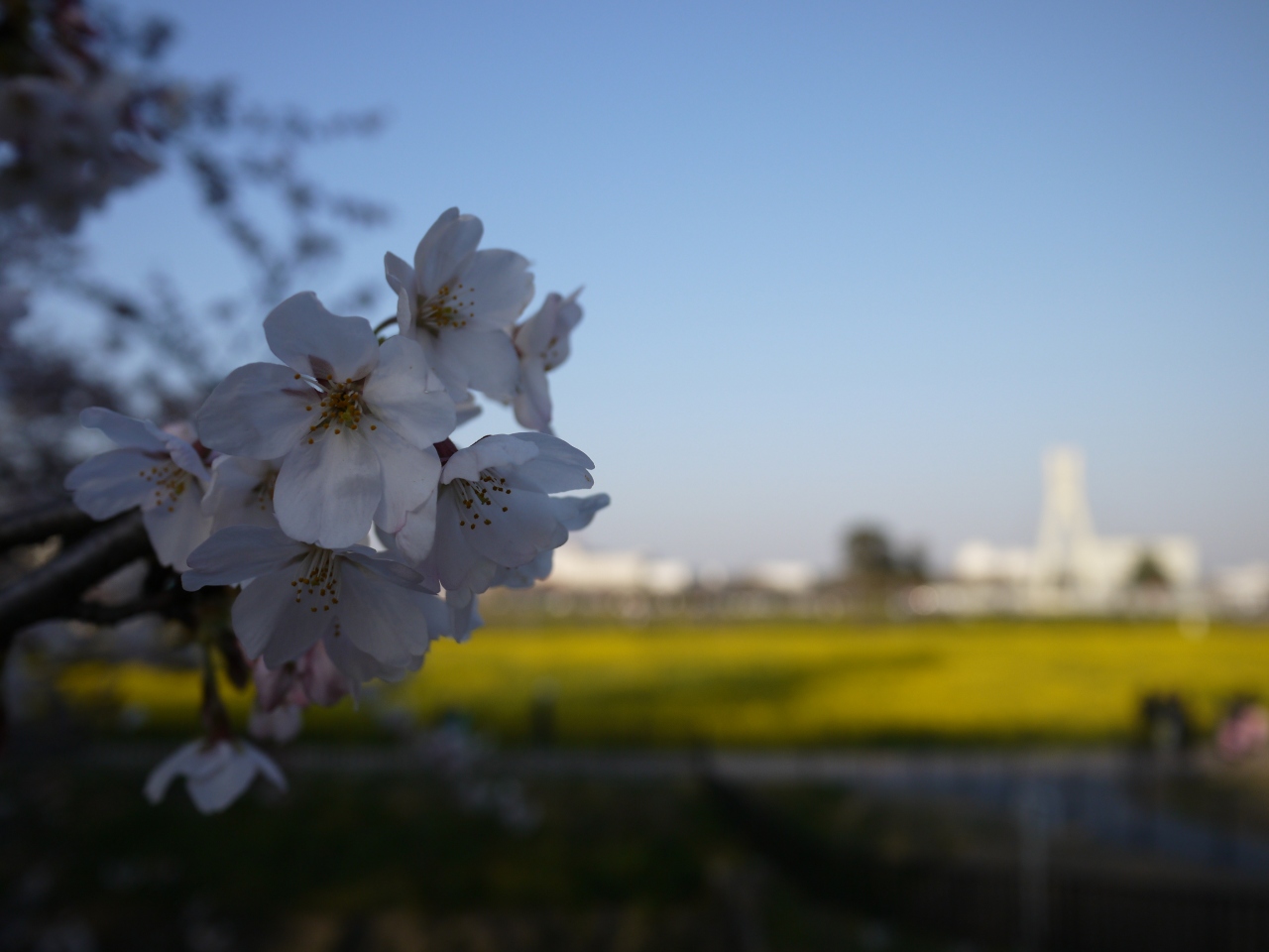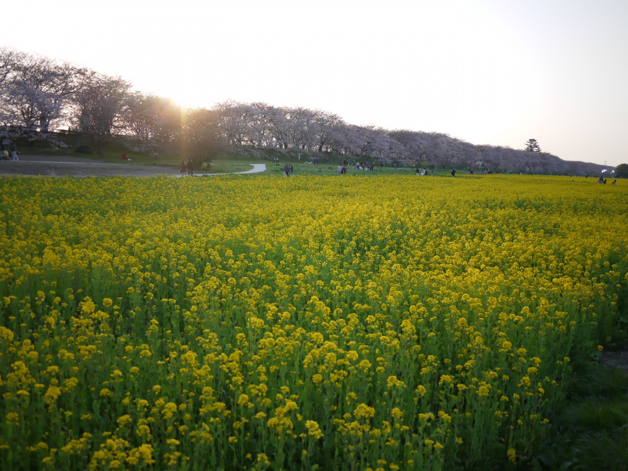 桜並木が菜の花畑に沿っていて、空の青・桜のピンク・菜の花の黄色の3色のコラボレーションが最高に綺麗です。