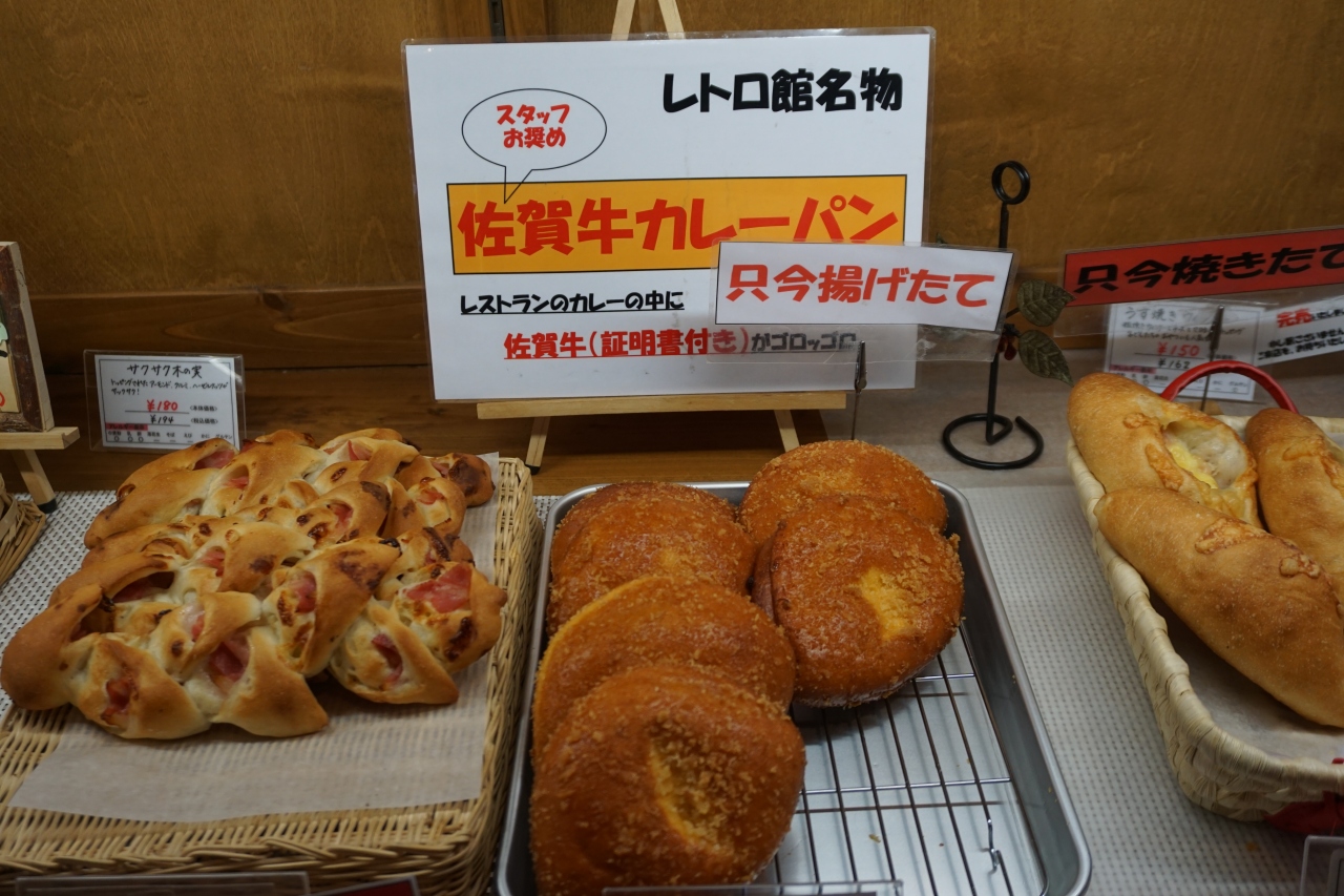 さがレトロ館を入ると、正面奥にあるのがベーカリーコーナー。米粉のパンなんかもありましたが、一番目立っていたのは佐賀牛のカレーパン。これはうまそうです。トロトロのルーにはけっこう大きめの佐賀牛が入っていて、豪華ですねえ。揚げたパンのざっくりした食感もいい。完成度の高いカレーパンです。