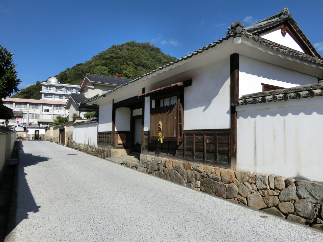 備中松山藩の城下町で、武家屋敷通り。路地の両側には白壁の長屋門や土塀が続いています。通りには一般の住宅もありましたが、武家屋敷通りの雰囲気に完全に溶け込んでいて全く違和感を感じられませんでした。一般公開の武家屋敷がありましたがパスして、町並みだけ見て帰りました。
