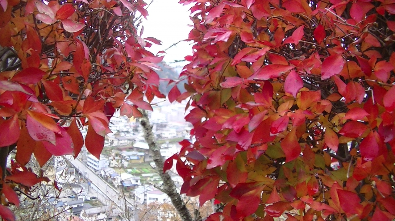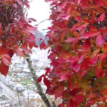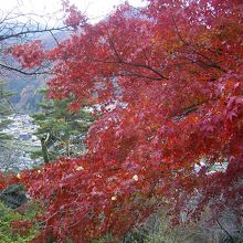 大月駅から岩殿山山頂まで1時間ほどで登れます。登山道の途中、岩殿山中腹辺りには丸山公園があり、私が訪れた時期は、最後の紅葉の時期で、大月市街をバックに公園の紅葉が綺麗でしたが、桜も見事だそうで、桜が満開になる4月上旬頃にはライトアップも行われるそうです。また、天気の良い日には富士山が、この中腹辺りからでも見る事が出来ます。