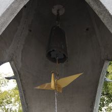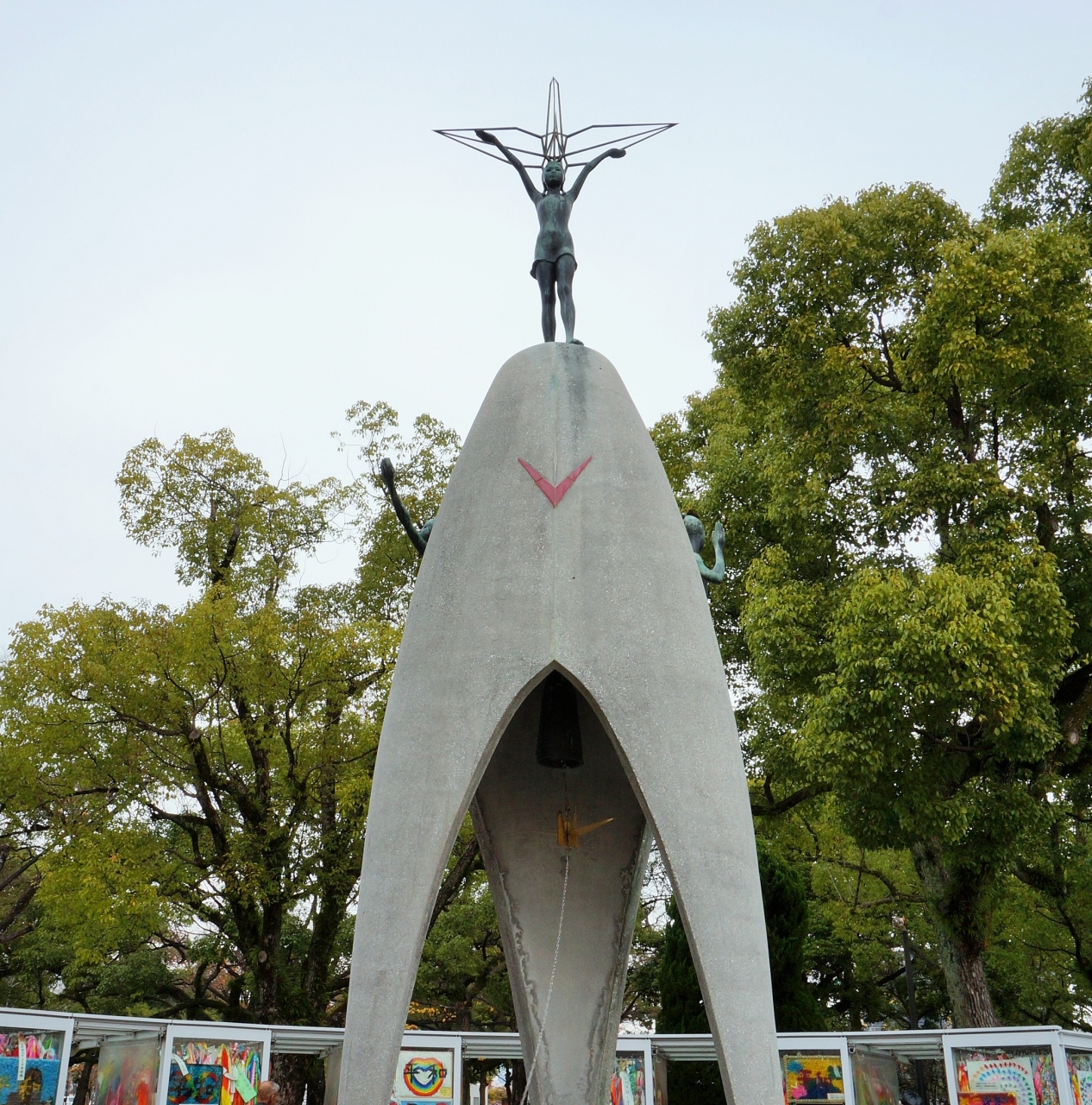 台座の上には金色の折り鶴を持つ少女のブロンズ像が立っています。