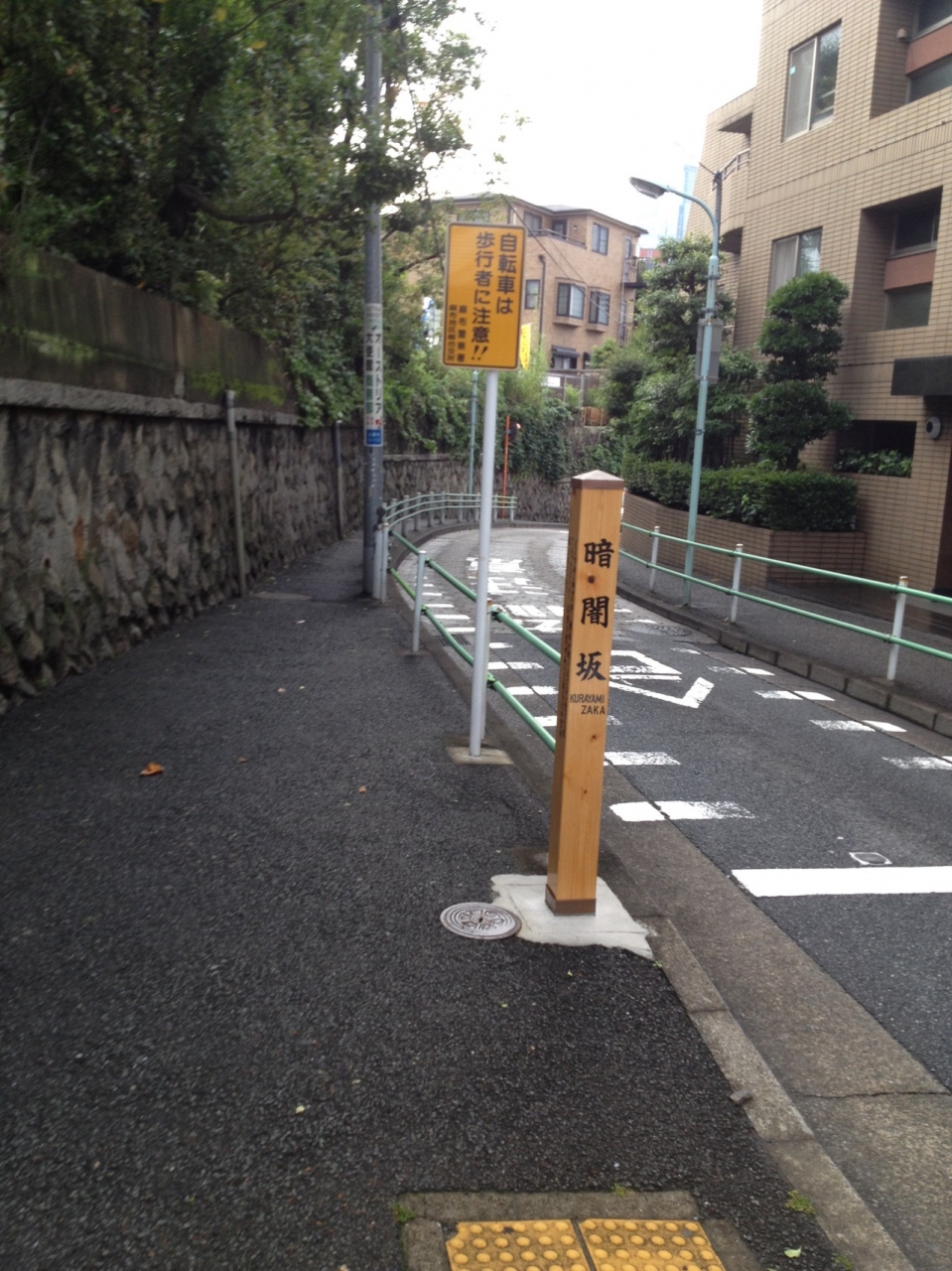 樹木が暗いほどおい茂った坂であったことから付いた名前のようです。また、以前の宮村町を通るため宮村坂とも言われていたようです。坂道の途中にオーストリア大使館があり、坂上では一本松坂、大黒坂と交わる坂の交差点です。