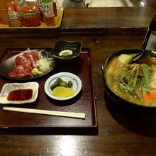 夕食ということで、ほうとうだけでは物足りないと思いカボチャほうとうと、馬刺しと小鉢が付いたセットを注文。