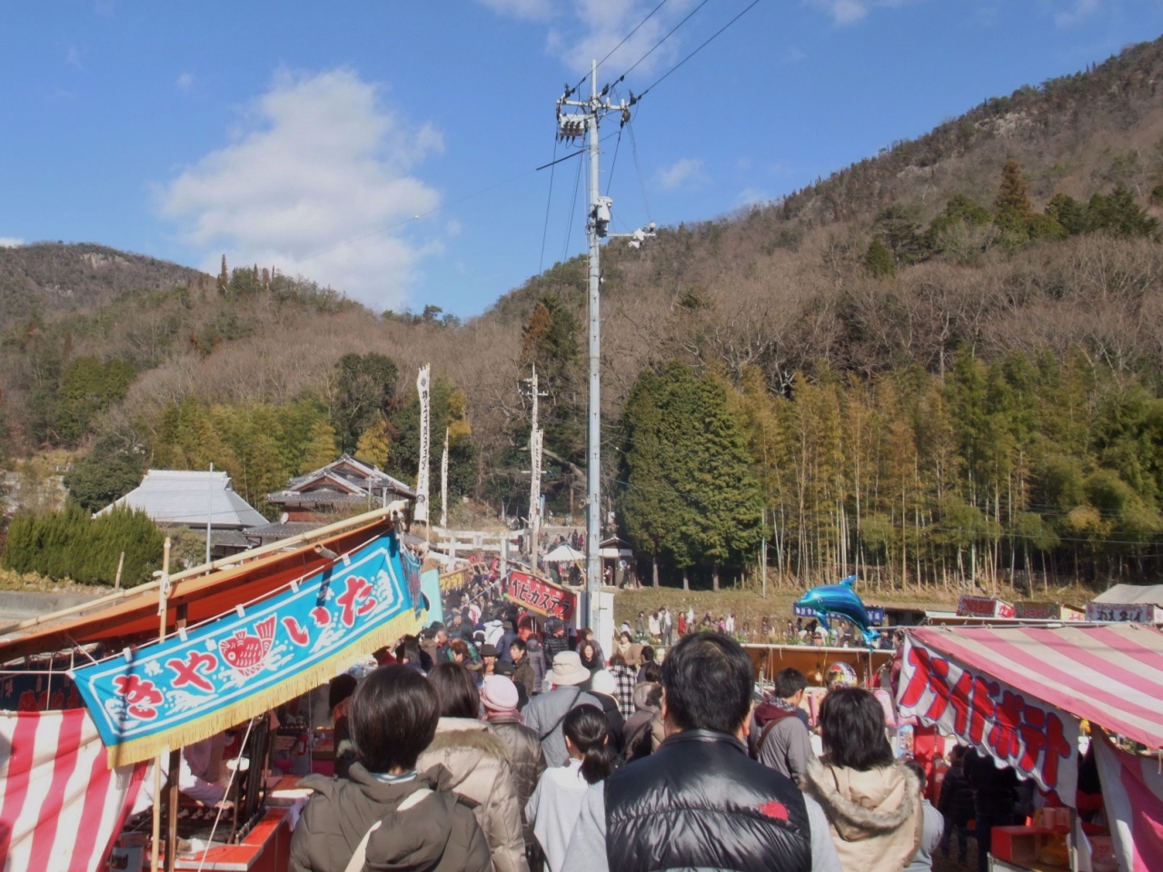 健康や農耕の神とされる牛頭天王が祀られている田倉牛神社は、江戸時代の初めごろに岡山県の東部、備前市吉永町福満というところに勧請されたようです。普段は静かな農村地にある神社ですが、この日ばかりは岡山県内から多くの参拝者が訪れ、参道にはたい焼き、フライドポテト、ベビーカステラなどを売る店、植木、刃物、農具を売る店、色んな店が出て賑わいます。