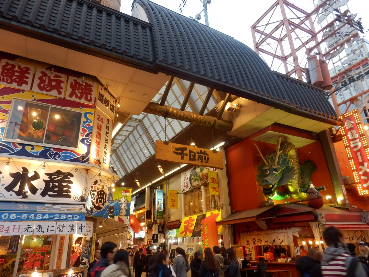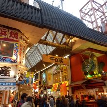 派手な看板が並ぶ道頓堀商店街を東へ進むと、行列が出来ているタコ焼き屋さんが見えると思います。その交差点から南に伸びるアーケード商店街がこちらです。入口の右側には大きな龍が目印のラーメン屋さんもあります。商店街の途中、法善寺横丁の入口もありますので、道頓堀から法善寺横丁へ行く際に通りました。