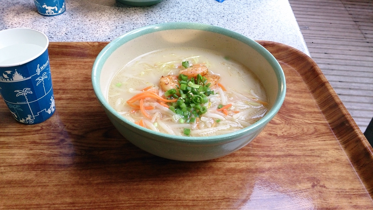 海老入り白湯麺(1010円)を食べました。少し遅めのお昼でしたが、皆さん並んでいて10分間ほど待ちました。ディズニーで汁ものを食べることは、初めてでしたが、おいしくてはしがすすみ直ぐに完食してしまいました。寒い日はとくに恋しくなるお店です。