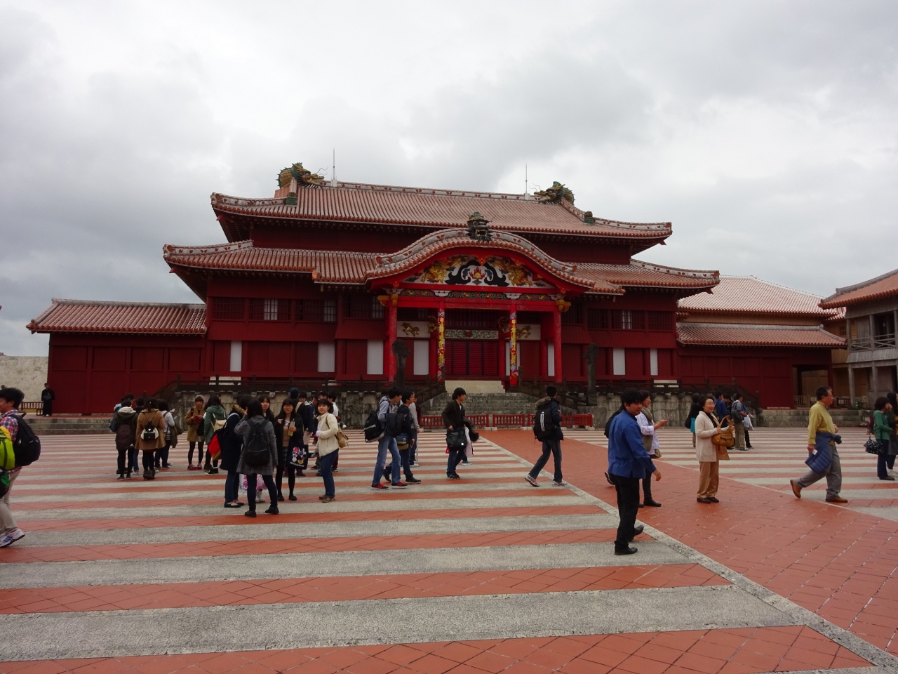3回目の沖縄訪問で、首里城も今回3回目の訪問です。守礼門をくぐり、しばらく歩いて行くと有料エリアになります。前回は有料エリアには入らなかったので、久しぶりに入って見る事にしました。入口では靴を脱ぎ(ビニール袋を渡されます)中に入ります。中は撮影禁止です。