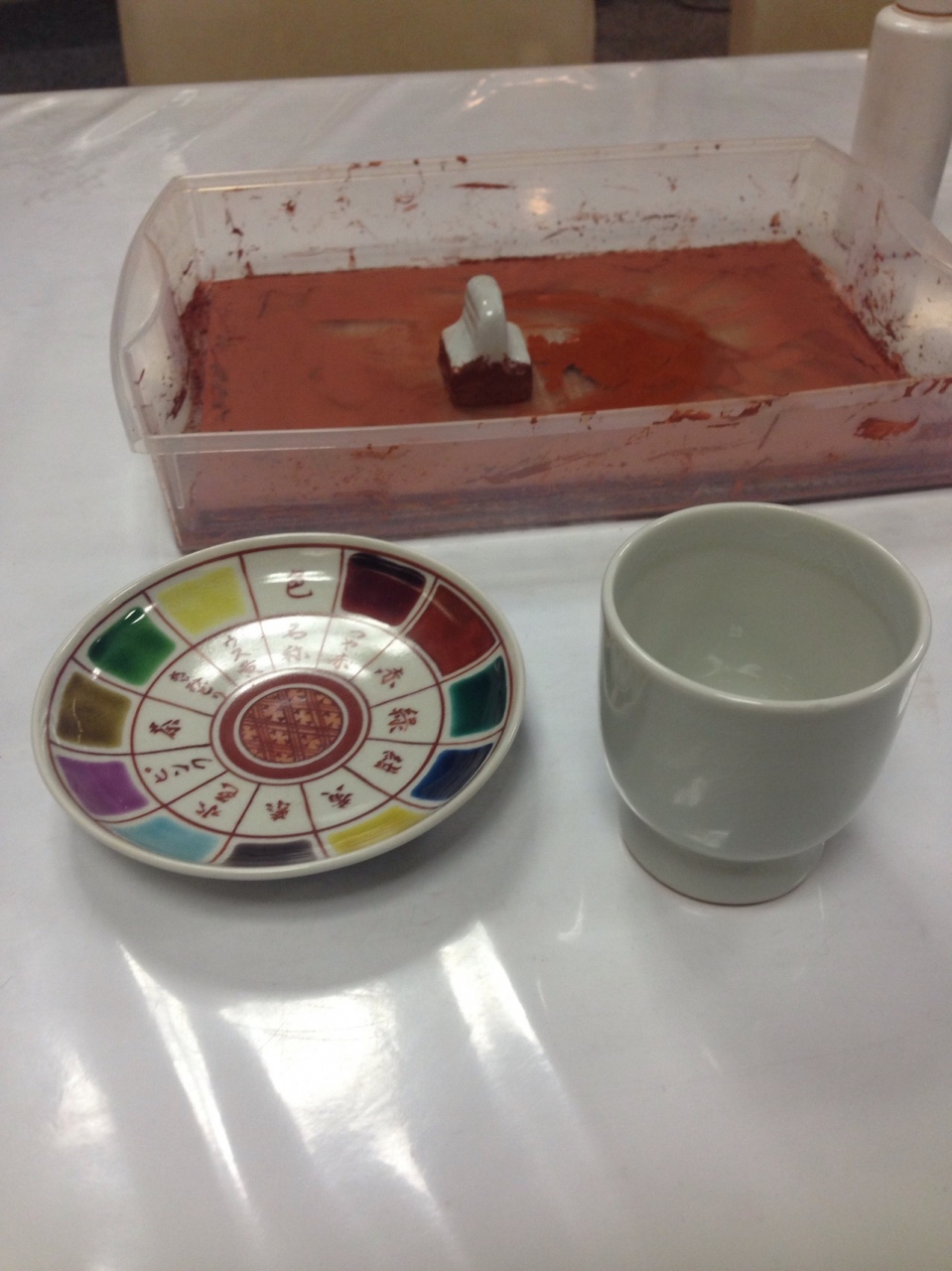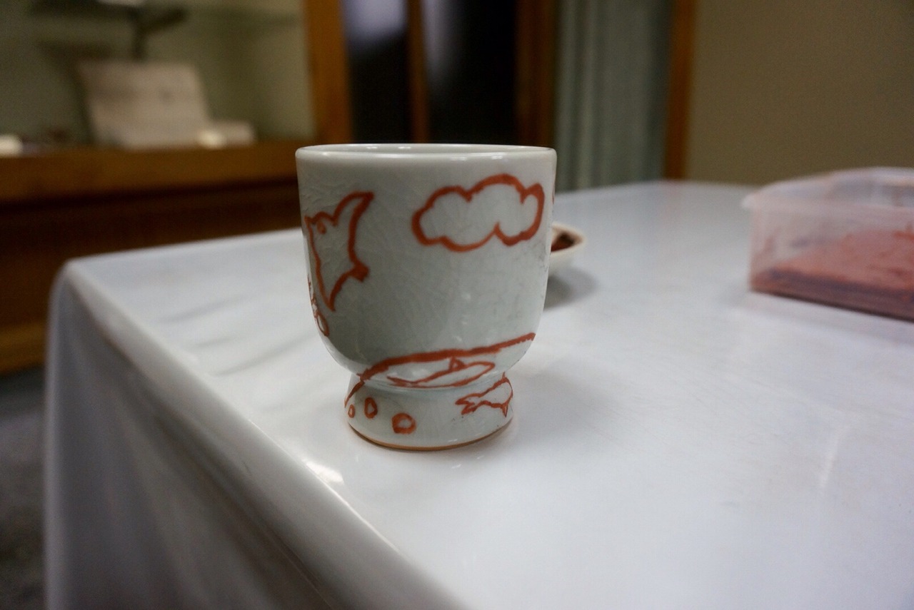 自分でするのは赤い線での絵付けだけで、色をのせるのは職人さんです。色は部分毎に指定することもできるし、職人さんにおまかせすることもできるそうです。かわいらしく、とか、派手に、とか、伝統的に、などイメージの希望だけでも良いそうです。九谷焼らしい配色が素敵だなと思ったので、私は完全におまかせにしました。どんな完成品が届くのか楽しみです。