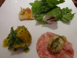 スープ、前菜プレート、メイン、デザート、