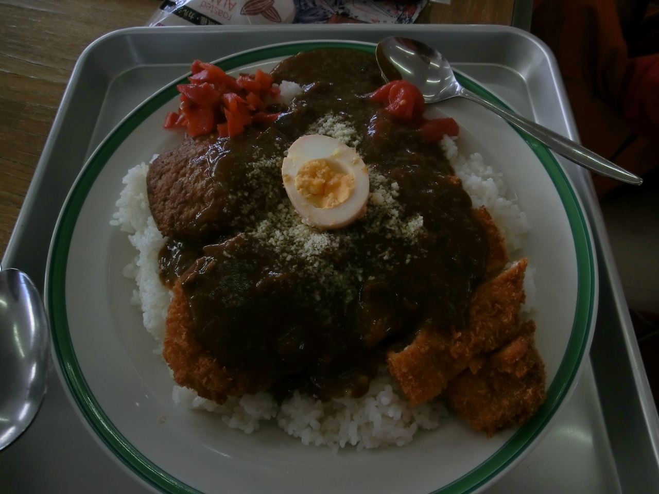 オリオンゲレンデのスノーダルマというレストランの「男山カレー」は1330円ですごい量です。とんかつ・コロッケ・ハンバーグ・ゆで卵が乗っています。ここは他のカレーや丼物が大盛りも同じ料金で、カレールーはお代わりをくれます。
