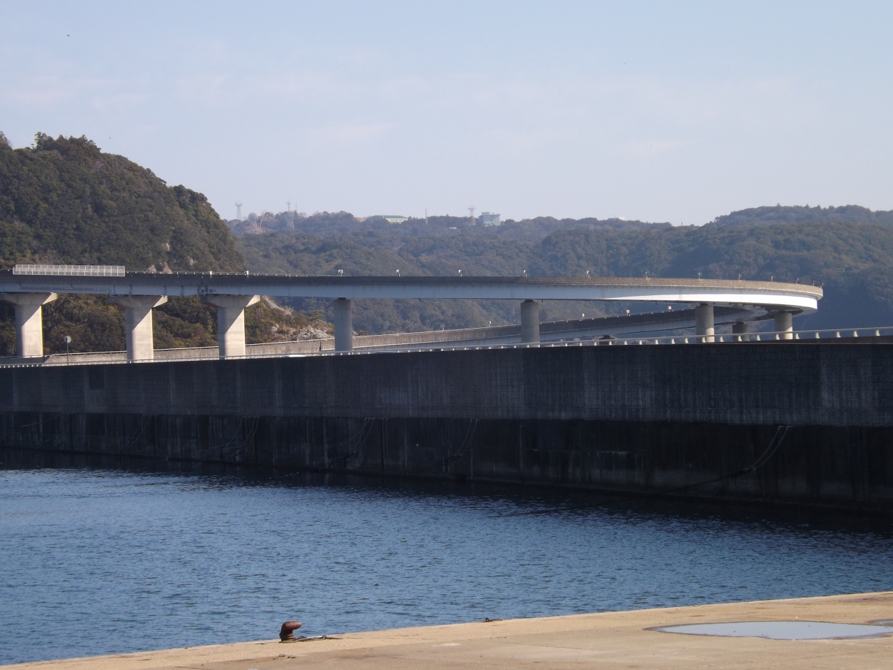 串本と紀伊大島を結んでいる橋が、くしもと大橋です。串本側から走った場合、まず直線があり、そのあとループ状になり、また直線になる感じで車を走らせることになります。橋を渡りきると小さな公園があり、駐車場もあります。ここからの眺めも良かったですし、くしもと大橋もすぐ近くに見えます。ただし、直線部分のみ、ループ状の見えるのは、串本側からだけです。なにはともあれ、便利になったものです。この、くしもと大橋のおかげで、車で行けるようになりました。しかも無料です。感謝・感謝ですね。
