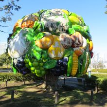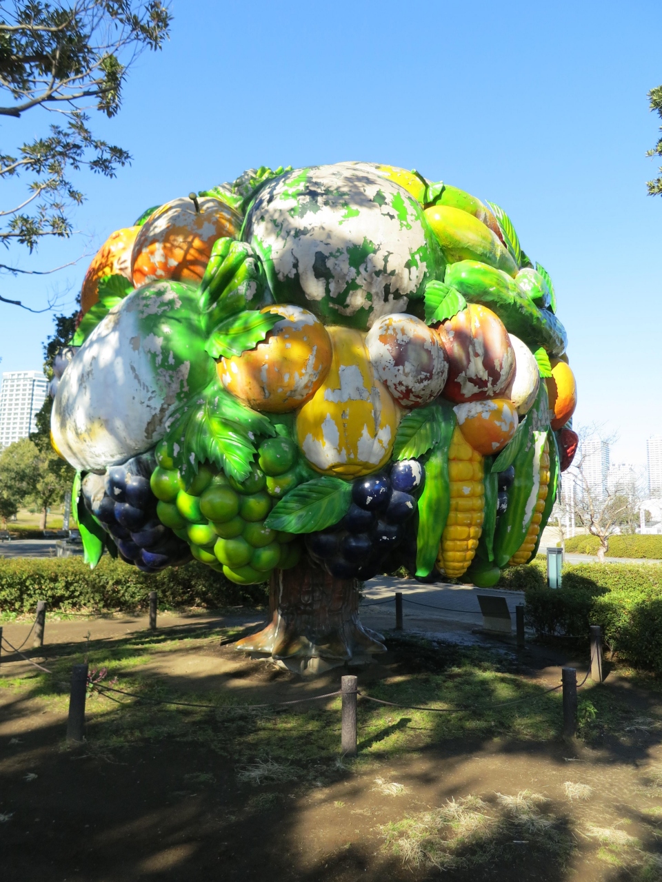 パシフィコ横浜前の海辺にある臨港パークの中の、芝生エリア、木立の中に立つ沢山のフルーツがなった大きな木のオブジェです。チェ・ジョンファのこの作品は、横浜ふじライオンズクラブが、設立30周年を記念して協賛し、「横浜トリエンナーレ2001」に出品され、その後2002年FIFAワールドカップ日韓共催を記念し、横浜市に寄贈されたもののようです。遠くからも目を引き、子どもたちは楽しそうに見ていました。