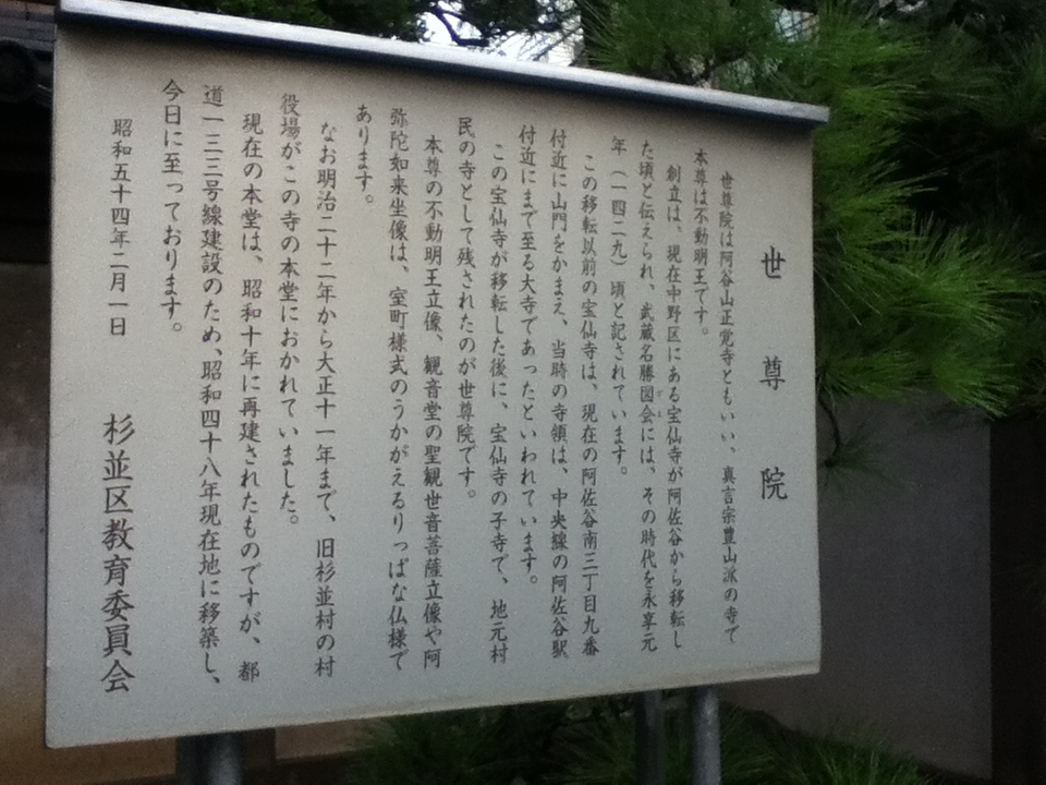 JR阿佐ヶ谷駅の北、駅前の南北の通り沿いにある真言宗豊山派のお寺。正面の山門は閉じたままだが、その横の入口が入ると、弘法大師の像があり、その右側に本堂がひっそりと立っている。本堂の周りは木々が立っている。境内は広くない。週末午後だったが、他に参拝者はいなく静かであった。また北にはお寺の幼稚園がある。創建時期は不詳であるが、昔、この周辺に中野宝仙寺があり、そのお寺が室町時代に中野へ移転した後に、その子寺、世尊院がこちらに残された。特に真言宗豊山派やこの界隈に関心や知識がある方には、訪問することをお勧めする。