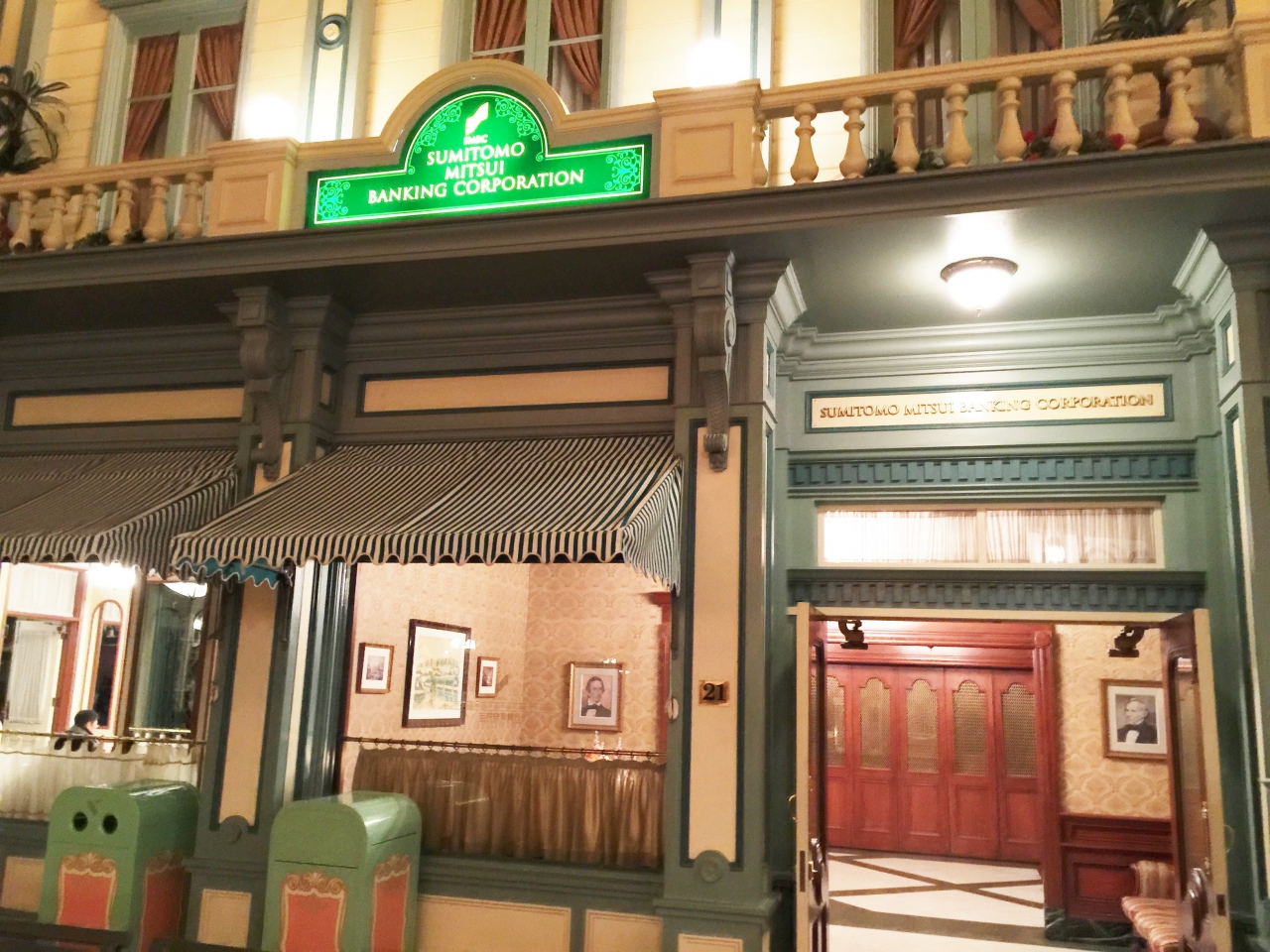 あれ、こんなところにおしゃれな銀行が、?と思いましたが、東京ディズニーランド内のワールドバザールには、三井住友銀行があるんですね。調べてみると、ここは出張所なので窓口があり、業務時間は普通の店舗と同じに業務をしているようです。