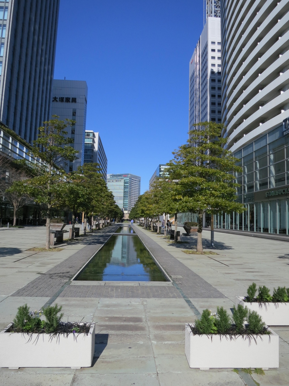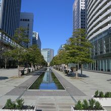 ランドマークプラザとクイーンズスクエアの間にある「ヨーヨー広場」からGENTO YOKOHAMA手前まで約700mに渡って一直線に整備されたグランモール公園は、美術の広場から北に向かうといちょう通りと交差し、ここでいったん公園は途切れます。いちょう通りを渡ったグランドセントラルタワー前の公園は、中央を水が流れ、都会のオアシスのような空間が広がっていて、今までとはまた違った公園になっています。